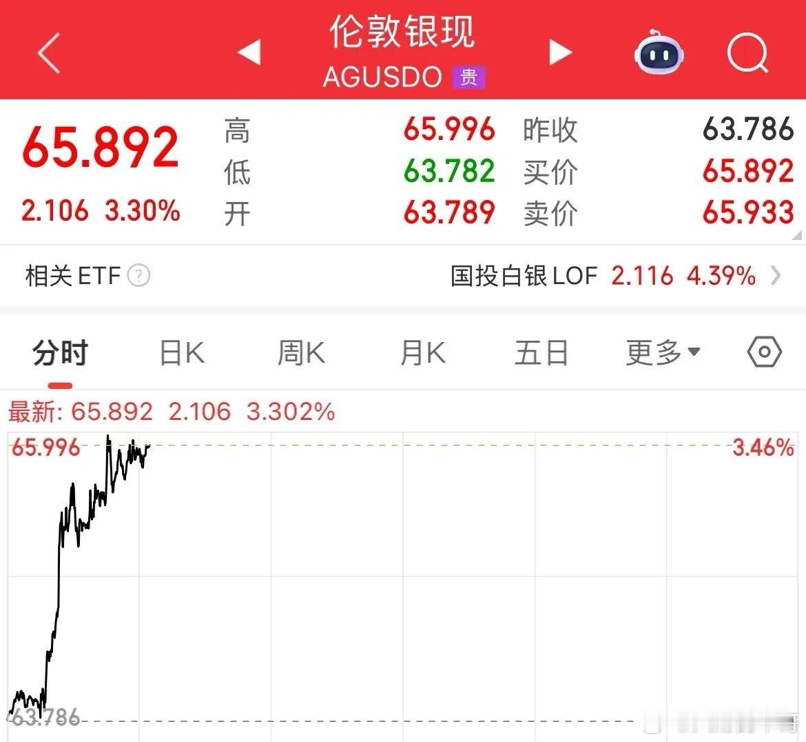每天涨2美元,本周就要突破70美元/盎司了,牛市什么样子,就是白银这样,疯狂的上涨,持续的上涨现货白银今天又暴涨超3%,本周三天已经累计涨幅6.87%,昨天短暂回调后,今天继续猛攻,白银的暴涨,带动现货黄金回至4300美元之上了,涨幅0.35%,贵金属的牛市要从年头贯穿至年尾收官了,今天白银最高已经是65.996美元/盎司了,看着真眼红啊!