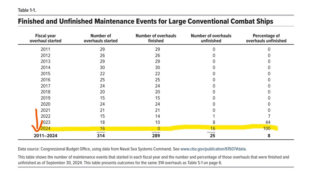 【16艘驱逐舰进厂大修,耗费2年时间,一艘都没修完】 五角大楼近日发布年终总结报告,公开了一段美国海军驱逐舰大修情况数据。 数据显示,美国海军在2024年对16艘伯克级驱逐采取了大修作业,但时至今日,这16艘驱逐舰没有一艘修完,完成度首次低至0%。 当然前一年的维修作业情况也不是很理想,大修18艘完工10艘,未完成率44%。 之所以会出现这种情况,是因为美国海军虽然有能力修伯克级,但具备修理资质的船厂、船坞以及工人太少了。 这就导致后来要大修的驱逐舰只能排队等船坞和工人完成前面的维修工作,但修理耗时又要远远多于等待耗时,最终结果就是要修的船越堆越多,根本修不过来。 24年的16艘船没完工,很可能是因为船厂还在修23年没修完的那8艘伯克