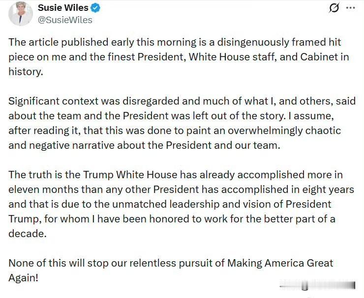 白宫幕僚长苏茜·怀尔斯: 今天清晨媒体发表的那篇文章,是一篇别有用心、带有误导性的抹黑文章,针对我以及历史上最出色的总统、白宫幕僚和内阁。 文章忽略了重要背景,并且对我和其他人关于团队与总统的许多评价都未作报道。我读完后认为,这样做的目的就是为了描绘一个极度混乱和负面的总统及团队形象。 事实是,特朗普白宫在短短十一个月内所取得的成就,已经超过了其他任何总统八年的工作成果,而这都得益于特朗普总统无与伦比的领导力和远见。我能为他工作近十年,深感荣幸。 这一切都无法阻止我们为“让美国再次伟大”而不懈奋斗的步伐!