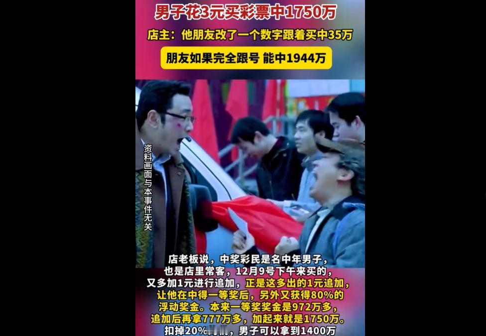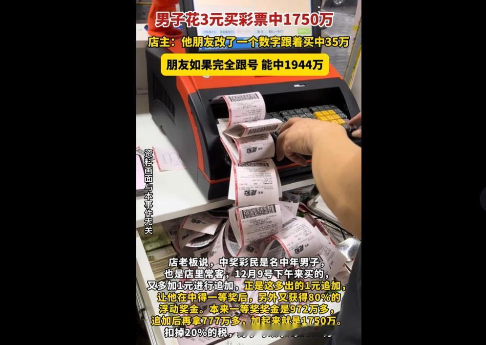 浙江一男子花 3 元买体彩大乐透追加票,中 1750 万一等奖;同行朋友改其号码花 4 元倍投,中两注二等奖揽 35 万。 男子领奖时称不敢信,网友调侃想要同款朋友。 3 元撬动千万奖金、4 元收获 35 万,这样的 “好运故事” 确实戳中很多人的心。 但得清醒:大乐透一等奖中奖概率约 1/2142 万,比出门遇流星还低,男子能中千万,还因追加投注多获 80% 奖金,这种运气真的可遇不可求。 中奖后也有现实问题要考虑:按我国税法,1750 万奖金需缴 20% 个税,到手实际只剩 1400 万左右;而且内蒙古曾有彩民晒中奖票,被人冒领奖金,这也提醒中奖者一定要捂好个人信息和彩票。 网友羡慕 “沾光朋友” 很真实,但别把偶然当常态。 彩票本质是 “公益 + 娱乐”,偶尔花几块钱图个念想没问题,要是抱着 “靠买彩票翻身” 的心态频繁购彩,反而容易陷入经济负担。 理性看待这份好运,才是对生活的清醒态度。