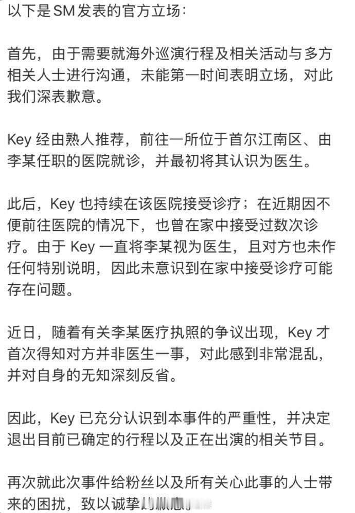 金起范就非法注射风波道歉 SHINee成员KEY通过个人社交平台发布手写道歉信,就近日卷入的“非法注射”争议正式致歉。信中表示对未能及时回应公众关切感到愧疚,承诺将认真处理此事。