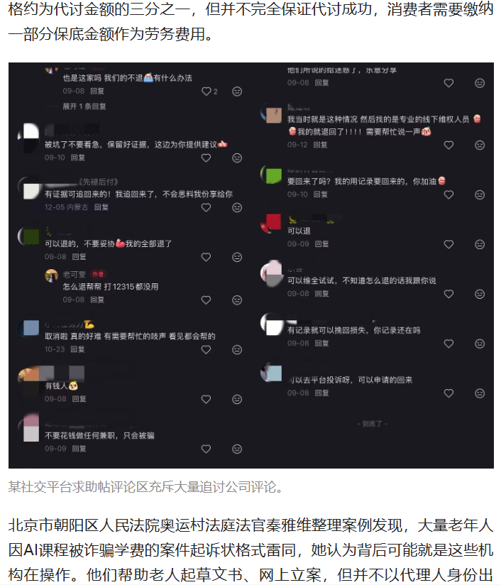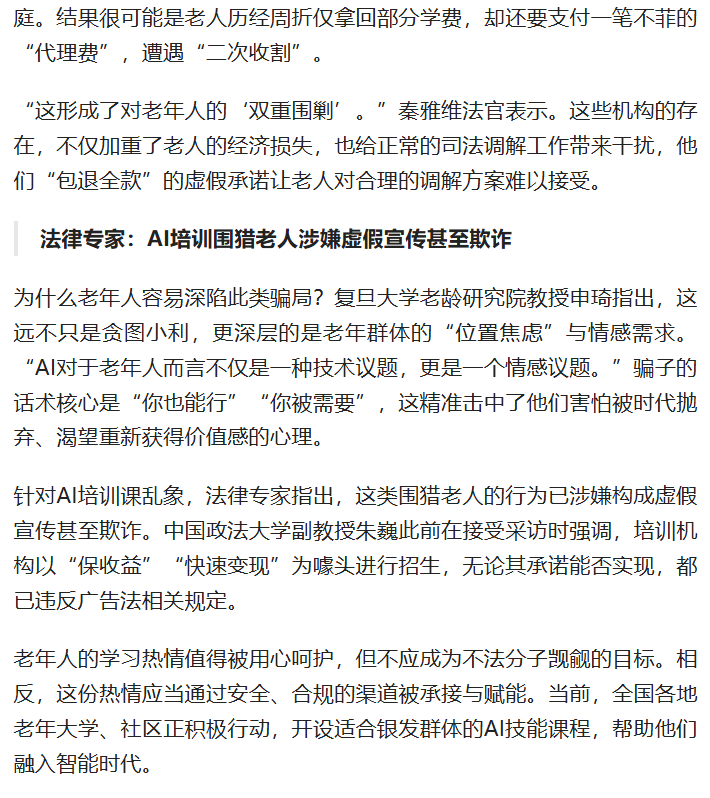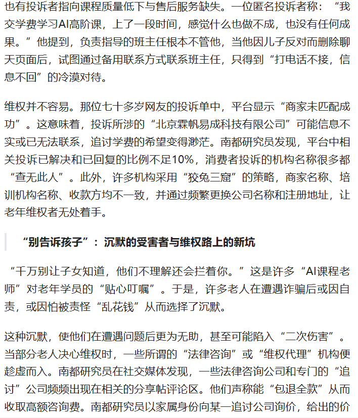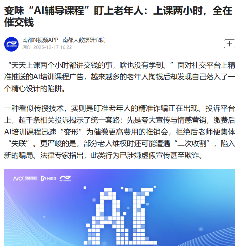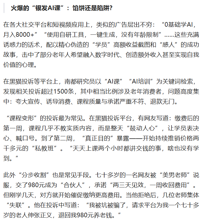 【#变味AI辅导课程盯上老年人#:#上课两小时全在催交钱#】“天天上课两个小时都讲交钱的事,啥也没有学到。”面对社交平台上精准推送的AI培训课程广告,越来越多的老年人掏钱后却发现自己落入了一个精心设计的陷阱。一种看似传授技术,实则是盯准老年人的精准诈骗正在出现。投诉平台上,超千条相关投诉揭示了统一套路:先是夸大宣传与情感营销,缴费后AI培训课程迅速“变形”为催缴更高费用的推销会,拒绝后老师便集体“失联”。更严峻的是,部分老人维权时还可能遭遇“二次收割”,陷入新的骗局。法律专家指出,此类行为已涉嫌虚假宣传甚至欺诈。在各大社交平台和短视频应用上,类似的广告层出不穷:“0基础学AI,月入8000+”“使用自研工具,一键生成,没有年龄限制”……这些充满诱惑力的话术,配以精心伪造的“学员”高额收益截图和“感人”的成功故事,击中了部分老年人希望融入数字时代、创造额外收入甚至实现自我价值的心理。在黑猫投诉等平台上,南都研究员以“AI课”“AI培训”为关键词检索,发现相关投诉超过1500条,其中相当比例涉及老年消费者,问题高度集中:夸大宣传、诱导消费、课程质量与承诺严重不符、退款无门。“课程变形”的投诉最为常见。在黑猫投诉平台,有网友写道:缴费后的第一周,课程几乎不教实质内容,而是整天“鼓动人心”,让学员表决心、喊口号。到了第二周,“真正目的”暴露——开始持续推销价格两千多元的“私教班”。“天天上课两个小时都讲交钱的事,啥也没有学到。”此外“分步收割”也是常见手段。七十多岁的一名网友被“美男老师”说服,交了980元成为“合伙人”,承诺“两三天见效,一周收回费用”。但刚学几天,对方就开始催促缴纳更高费用。当他拒绝后,几位老师集体“失联”。他在投诉中写道:“我被坑被骗了,请求平台为我一个七十多岁的老人伸张正义,退回我980元养老钱。”