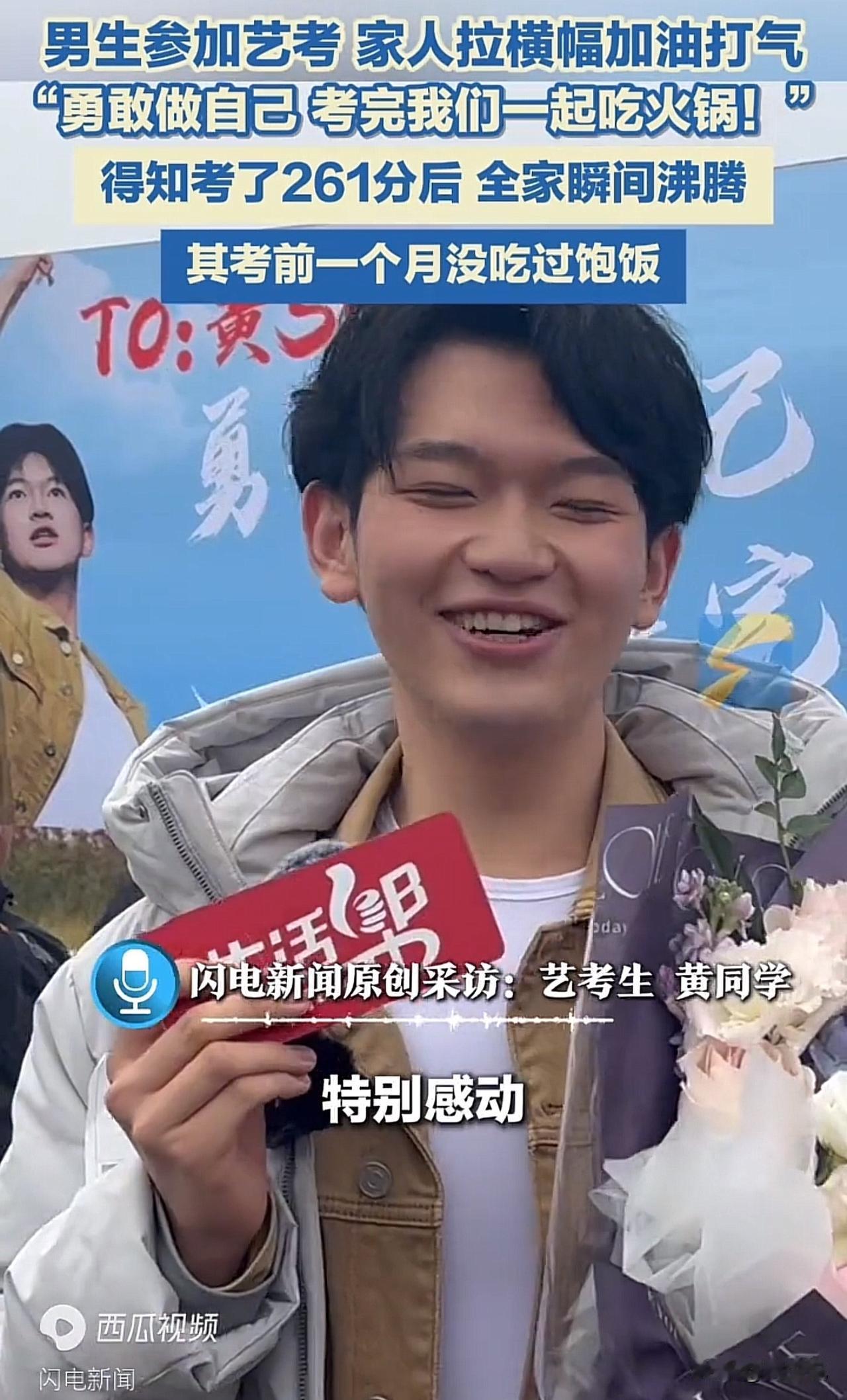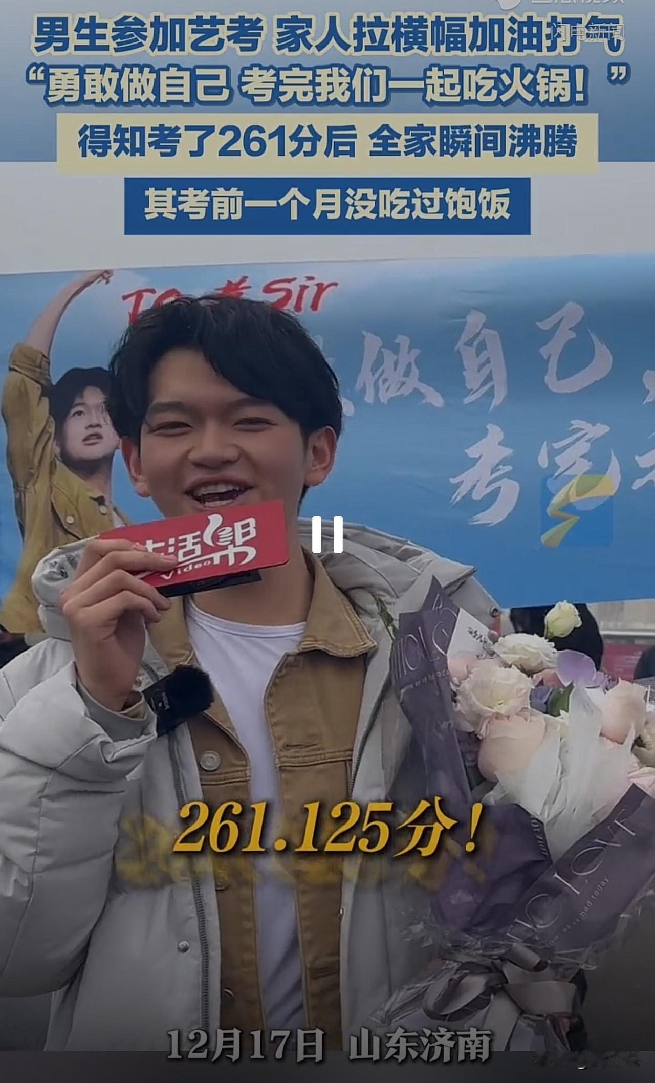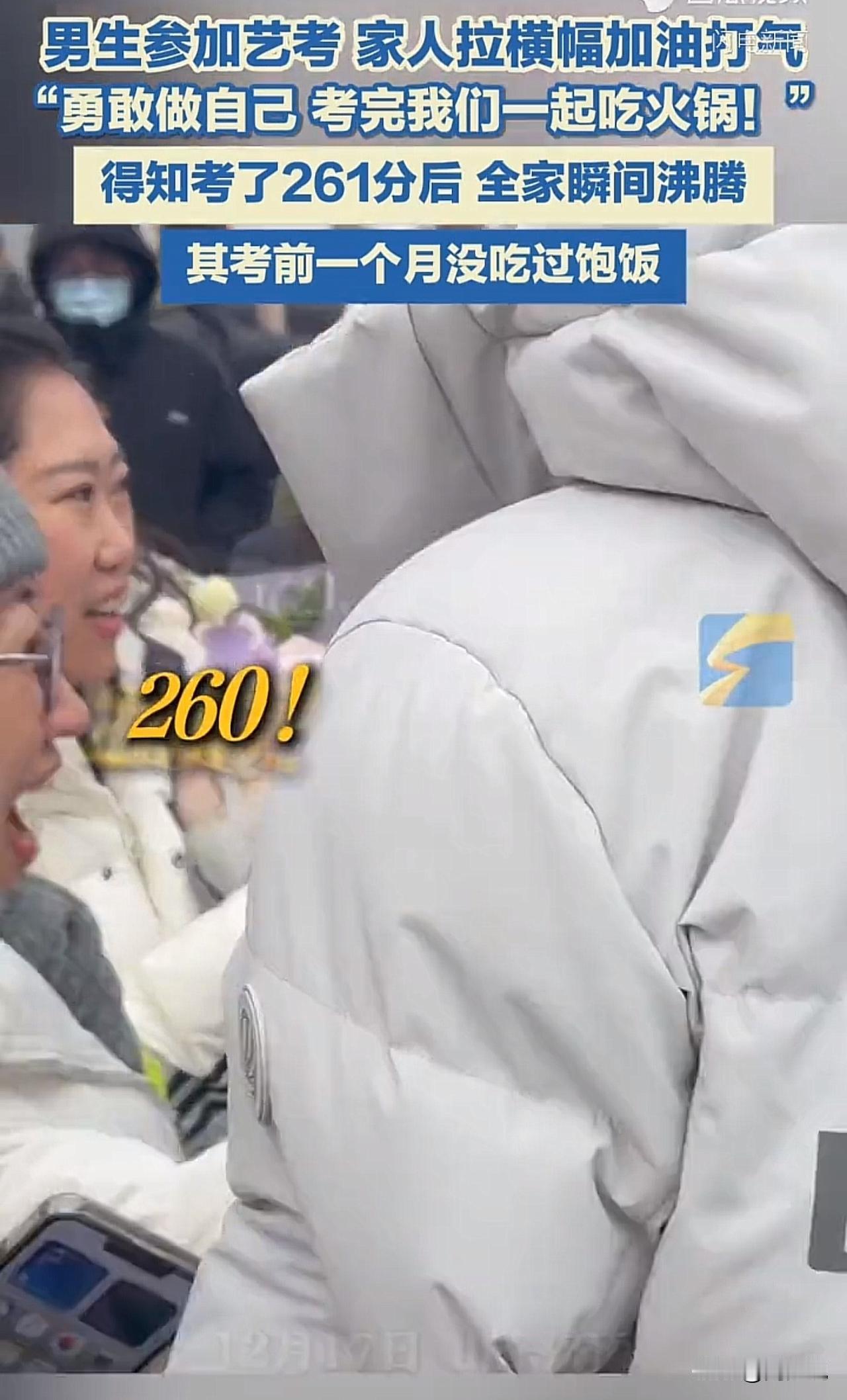 #男生参加艺考 家人拉横幅加油打气#“这位山东男生艺考火了!”山东济南,一场艺考结束后,一名男生走出考场,家人早早拉起横幅为他加油:“勇敢做自己,总有一束光在等你!考完我们一起吃火锅。” 当得知他考出261分的好成绩时,全家瞬间沸腾,相拥欢呼的样子让人热泪盈眶。谁能想到,为了冲刺艺考,这个男生考前整整一个月都没吃过饱饭,日夜苦练,硬是熬了过来。 此视频曝光后,众多网友纷纷表示:“这横幅太暖心了!比起逼孩子考高分,这种鼓励才是最好的教育,孩子肯定越学越有劲儿!” 周少想说这个男生的逆袭,戳中了无数人的泪点,更藏着最朴素的教育道理。比起一味施压,家人的理解、鼓励和陪伴,才是滋养孩子成长的养分。 他没吃饱和的坚持,是少年不服输的韧劲;家人横幅上的话语,是家庭教育最温暖的模样。 真正的教育,从来不是逼着孩子“必须成功”,而是告诉他“你只管努力,我们永远在你身后”。这份双向的奔赴,才是青春里最珍贵的礼物。#寻美三湘# #长沙新朋友#