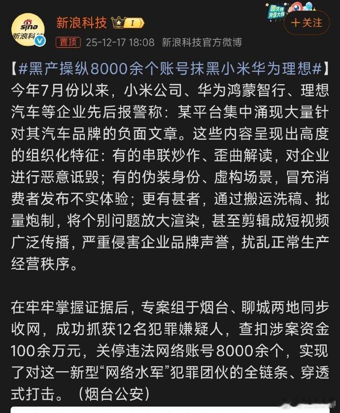 黑产操纵8000余个账号抹黑小米华为理想 同时抹黑小米、华为、理想??成功抓获12名犯罪嫌疑人,涉案资金100余万,关停网络账号8000余个。这规模也不大啊,才100万的涉案资金,如果扣除手机列阵(用来引导/刷屏)所花的钱,真的没多少钱来支付这些违法者的收入吧……感觉这个和之前李斌说的,每月有人花3千万到5千万买水军黑蔚来的情况不符呢。蔚来应该还不是被黑的最狠的吧,小米汽车和华为系智驾汽车应该是被水军冲击最厉害的。按照李斌说的,这个水军市场感觉一年百多个亿应该是有的。