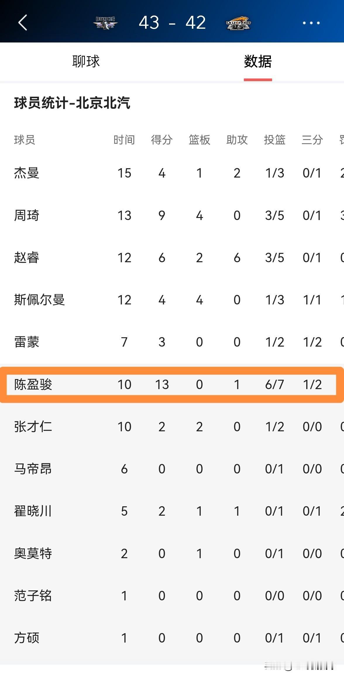 北京北汽后卫陈盈骏真是彻底的投疯了!在今天北京北汽主场迎战辽宁本钢的比赛中,目前双方半场战罢,北京北汽以43:42领先对手。值得一提的是,在前两节比赛中,陈盈骏延续了上一场比赛的火热手感,他在替补出战的10分钟里,投篮7中6,其中三分球2中1极其高效的砍下13分1助攻2抢断。