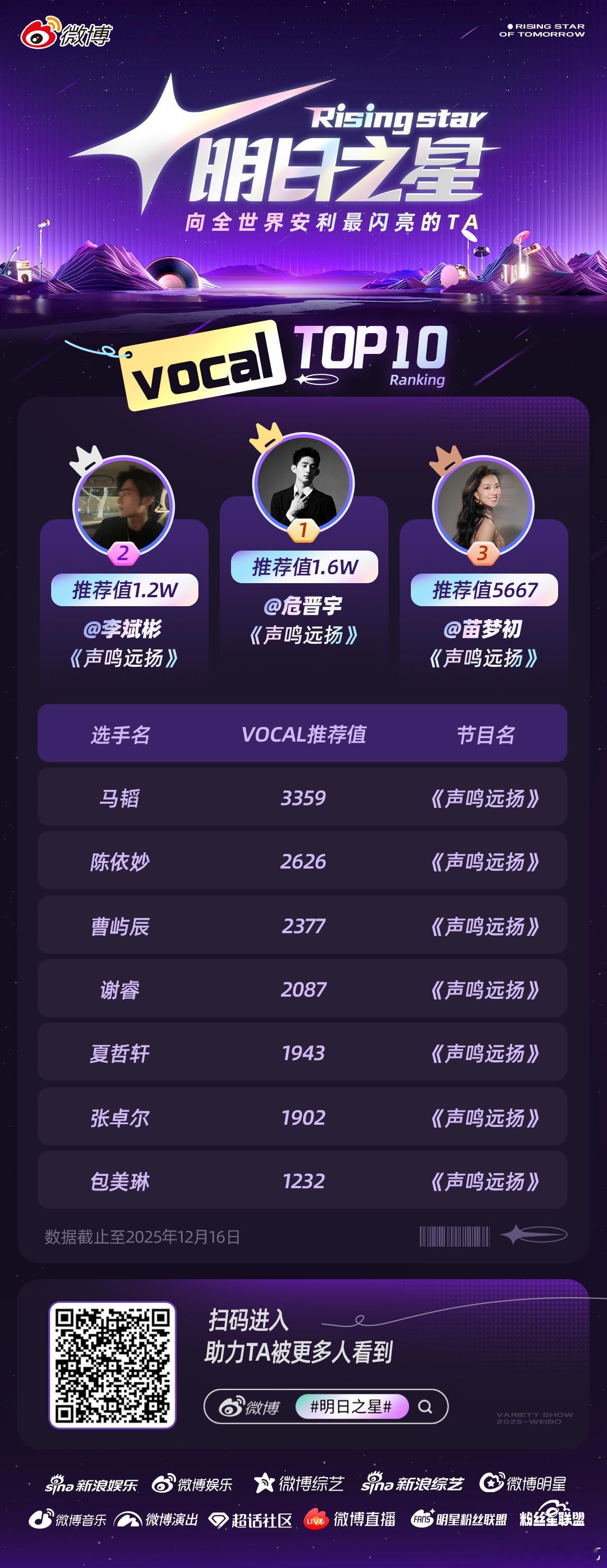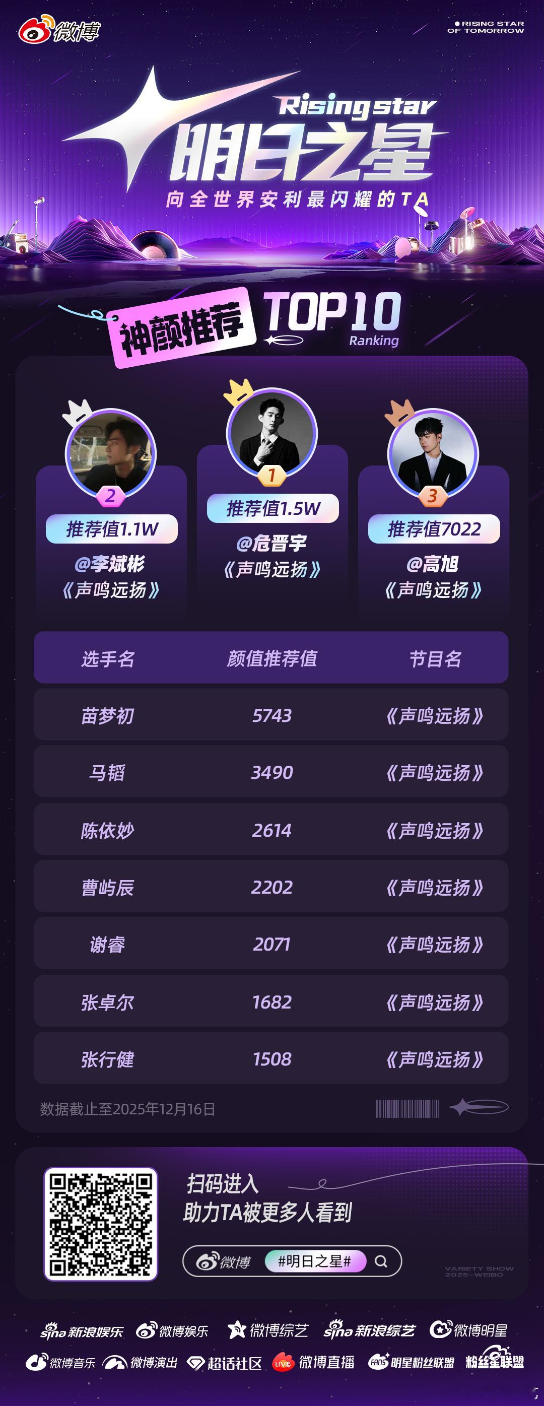 明日之星 一周排名TOP10新鲜出炉!潜力之星🪩、神颜之星🪩、vocal之星🪩三大赛道推荐值排名TOP10如下,来看看你心动的TA上榜了吗? 明日之星推荐值top10【潜力之星💫】TOP1 《声鸣远扬2025》TOP2 《声鸣远扬2025》TOP3 《声鸣远扬2025》【神颜之星💫】TOP1 《声鸣远扬2025》TOP2《声鸣远扬2025》TOP3《声鸣远扬2025》【vocal之星💫】TOP1 《声鸣远扬2025》TOP2 《声鸣远扬2025》TOP3 《声鸣远扬2025》戳下图,get完整TOP10名单!每日推荐火热进行中,下周同一时刻送你心中的最闪耀的TA登榜!>>《明日之星》全民推荐(数据时间截止12月16日24:00)