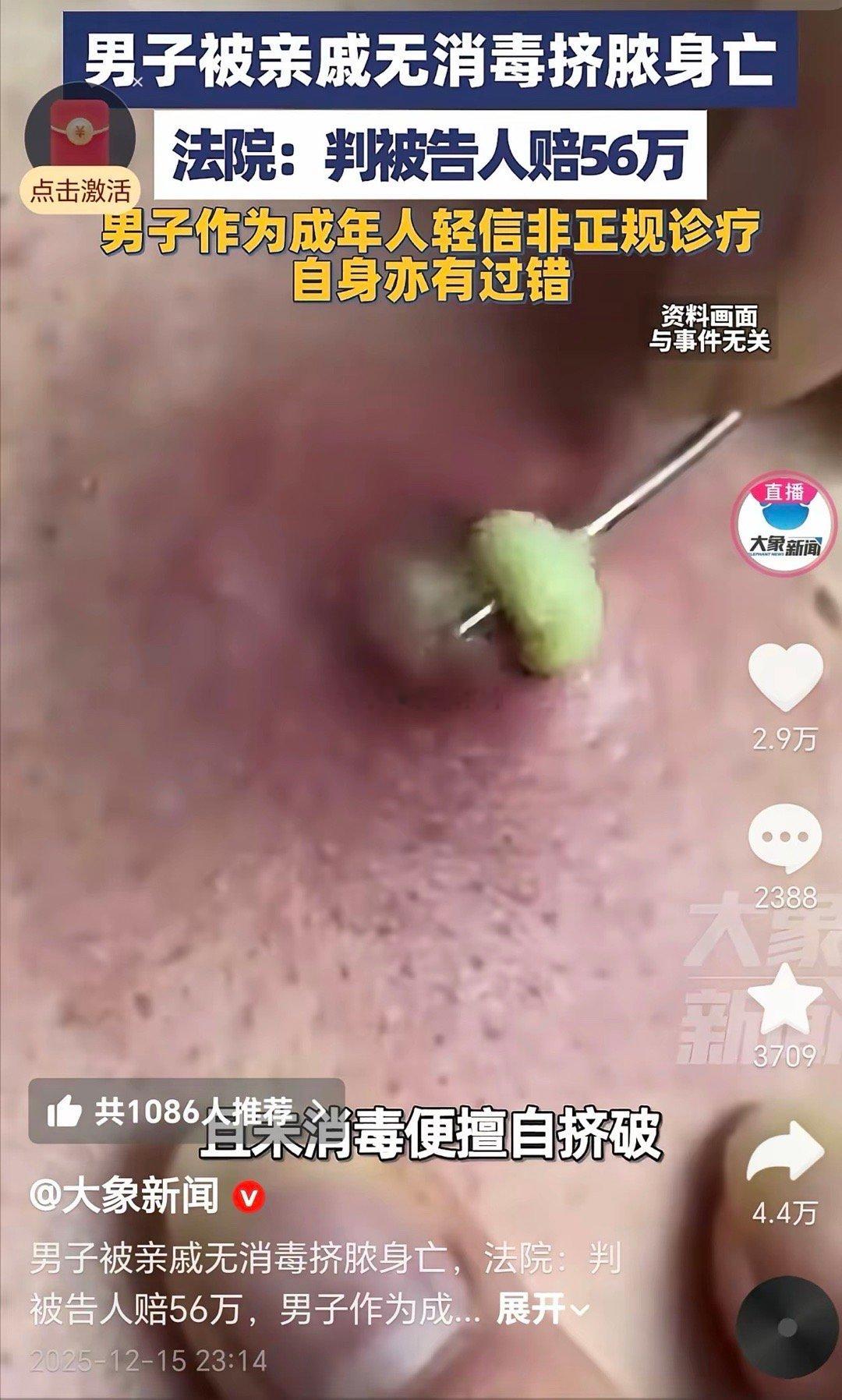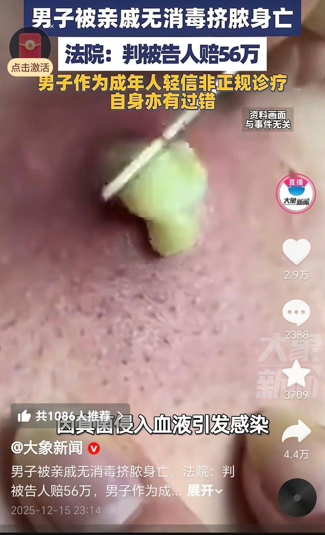 42岁男人的腿,被亲戚一把掐开血洞。零消毒,徒手挤脓。72小时后,真菌啃光他全身血液,法院:56.7万,赔!王先生腿疼三年,医院片子一堆,却觉得“熟人更靠谱”。单女士拍拍胸口:“我摸骨十年,比机器准!”她指甲未剪,直接掐进脓肿,“噗嗤”一声,脓液飙袖口。王先生当场疼跪,她还笑:“毒水出来好得快!”三天后,他高烧41℃,血压掉到60/40。ICU医生摇头:“真菌吃遍血,救不回来。”法院判了:无资质、无消毒、无底线,70%命债=56.7万。王先生自担30%,因“成年人该有常识”。一条命,只换来朋友圈静默,再没人敢提“我手感准”。56.7万到账那天,单女士连夜搬家,头像全黑。王妈妈坟前烧判决书,火光照出两行字:“钱能买责任,却买不回儿子的腿。”别把命交给熟人,真出事了,赔偿金只是给活人买心安,死人连道歉都听不到。亲戚无证“动手”致死,70%赔偿,轻了还是重了?A. 还太轻,应直接按“非法行医”坐牢!B. 已足够,自己轻信也得买单。评论区站队,等你开撕!