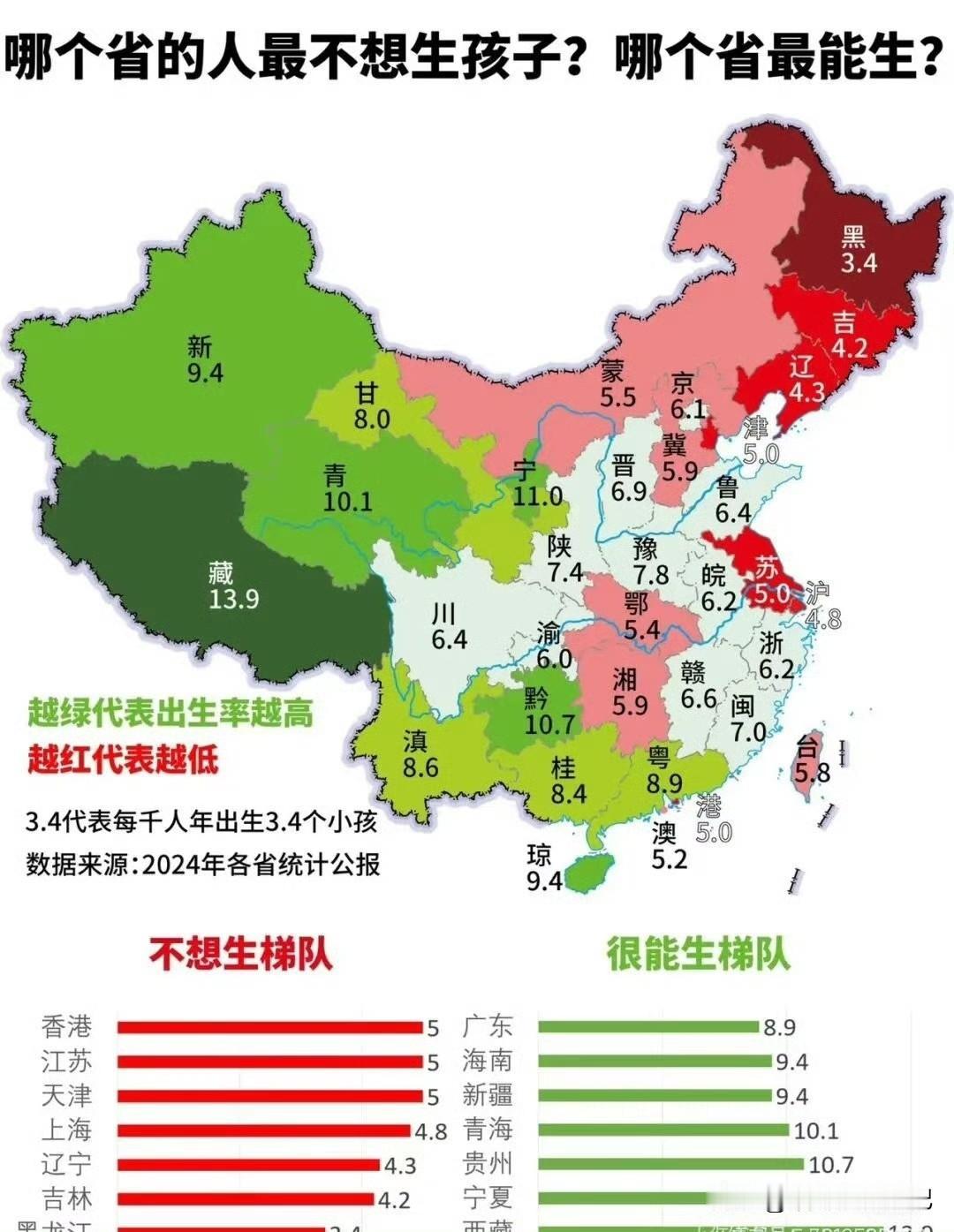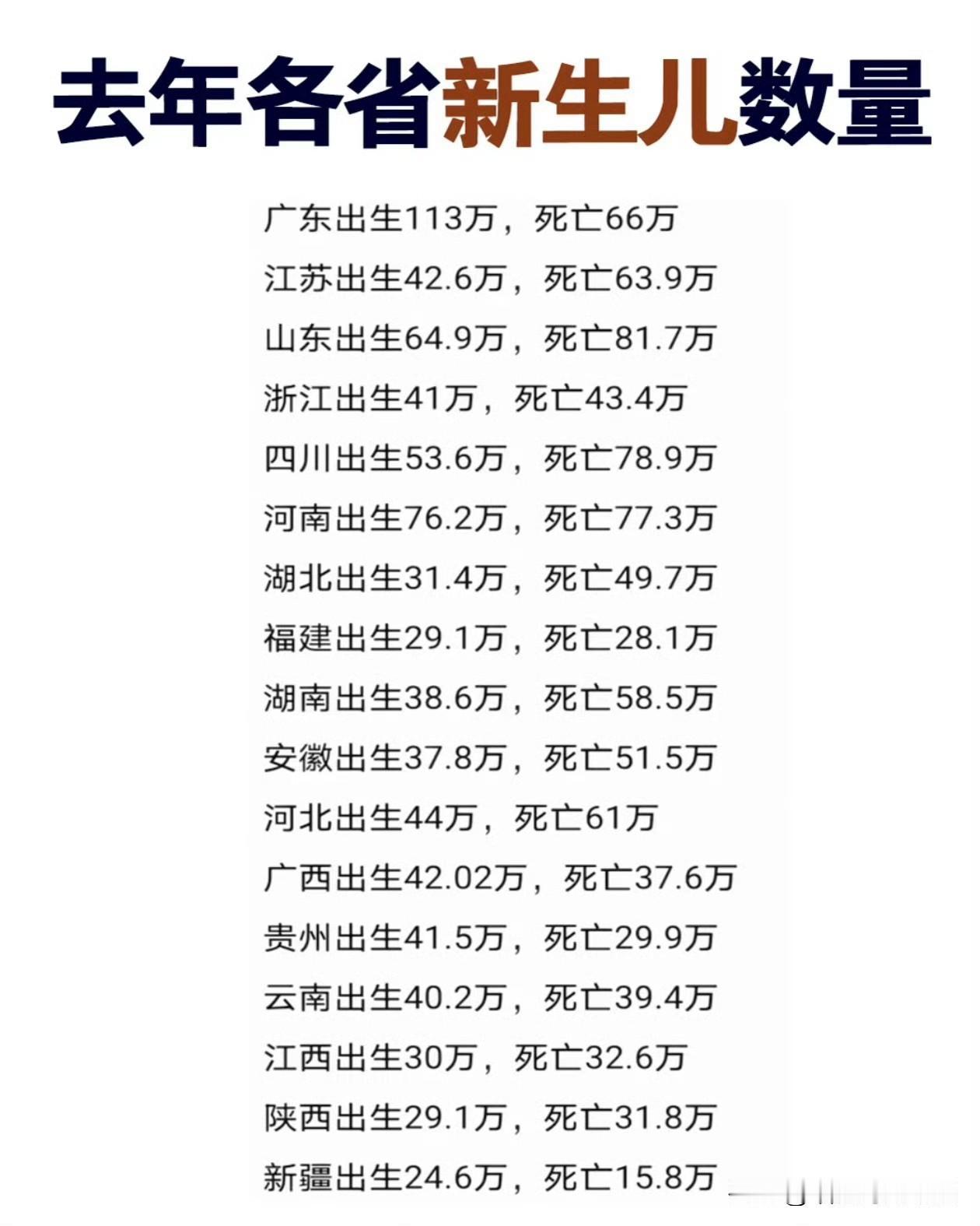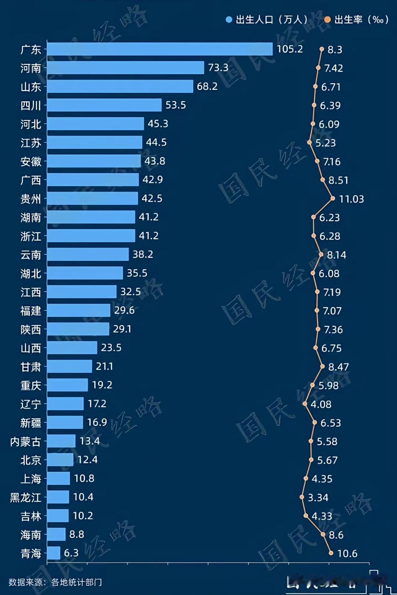 最能生娃省份排名出炉,广东七连冠,河南“人多力量大”,山东“硬撑前三”。 2024数据刚出炉,广东再次以113万新生儿一骑绝尘,连续七年拿下“最能生”金牌;河南、山东分列二三名,川苏黔浙紧随其后。 广东“娃界深圳”——113万新生儿,比江浙沪包邮区加起来还多,全靠3000万外来年轻打工人+潮汕“生到阿公满意”。 河南“中原产娃机”——76.2万,全国第二,听起来猛,但一算自然增长率-0.11‰,生的没跑的快 。 山东——64.9万,仍第三,可出生率才6.42‰,16年二孩潮透支干净,现在年轻人:先还房贷,再谈娃 。 西南双骄——贵州出生率10.74‰,西藏13.72‰,经济欠发达,却最敢生“越山区越添丁”定律还在 。 东北——黑吉辽集体跌出前20,辽宁新生儿数量被新疆反超,年轻人跑了,生娃成了“奢侈品” 。 生率垫底的东北三省,2024自然增长率依旧负值,年轻人“连对象都不急,哪来的娃”。说到底,生育不是不想,而是“不敢+不配”,不敢辞职、不配房贷、不配托育。 让人意外的是,常住人口总量并不突出的广西,居然以8.37‰的出生率冲进前八,比江苏、浙江还高。原因有三 1. 返乡+流入“双年轻”:珠三角务工的桂籍青年回流,直接把婚育年龄人口拉满; 2. 县域房价友好:南宁外大部分地市均价不过万,生得起也养得起; 3. 宗族氛围仍在:传统“多子多福”观念在乡镇保留度远高于长三角。 别光嘲笑“生不动”,房价、托幼、职场歧视随便单拎一个就能劝退一票人。榜单背后拼的不是“爱不爱孩子”,而是“敢不敢负担”。想真正逆转,靠发钱发奶粉只是“止痛”,把“房价-托育-职场歧视”三座大山搬走,才是“动刀”。 ——🌱—— 榜单看完,你觉得家乡排第几? 评论区告诉我:如果国家给你“生娃套餐”,你最想要哪项福利?[图源网络]