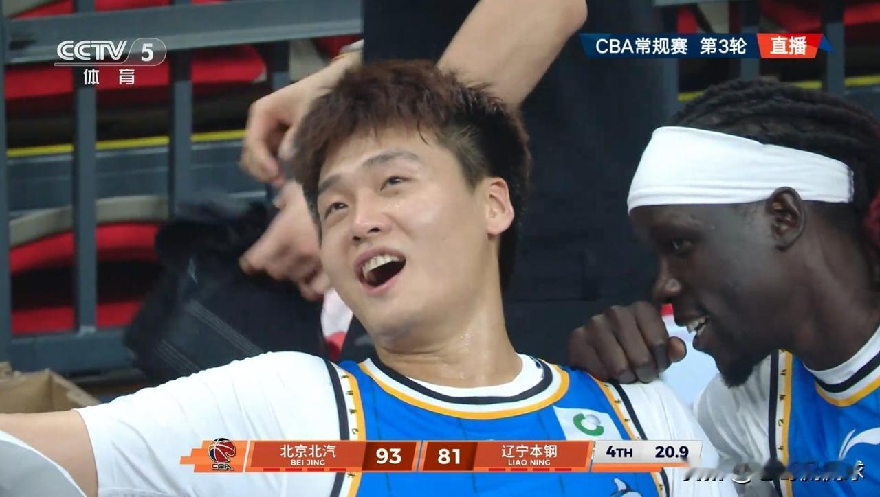 北京北汽明星后卫赵睿真是开心坏了!在今天北京北汽主场迎战辽宁本钢的比赛中,当时距离全场比赛结束还剩最后的20.9秒,北京北汽以93:81领先对手,基本上胜局已定了。当转播镜头给到北京北汽的替补席时,只见此役轻松得到11分7助攻2抢断的赵睿开心的像个孩子,他的脸上挂满了微笑,整个人看起来特别开心。