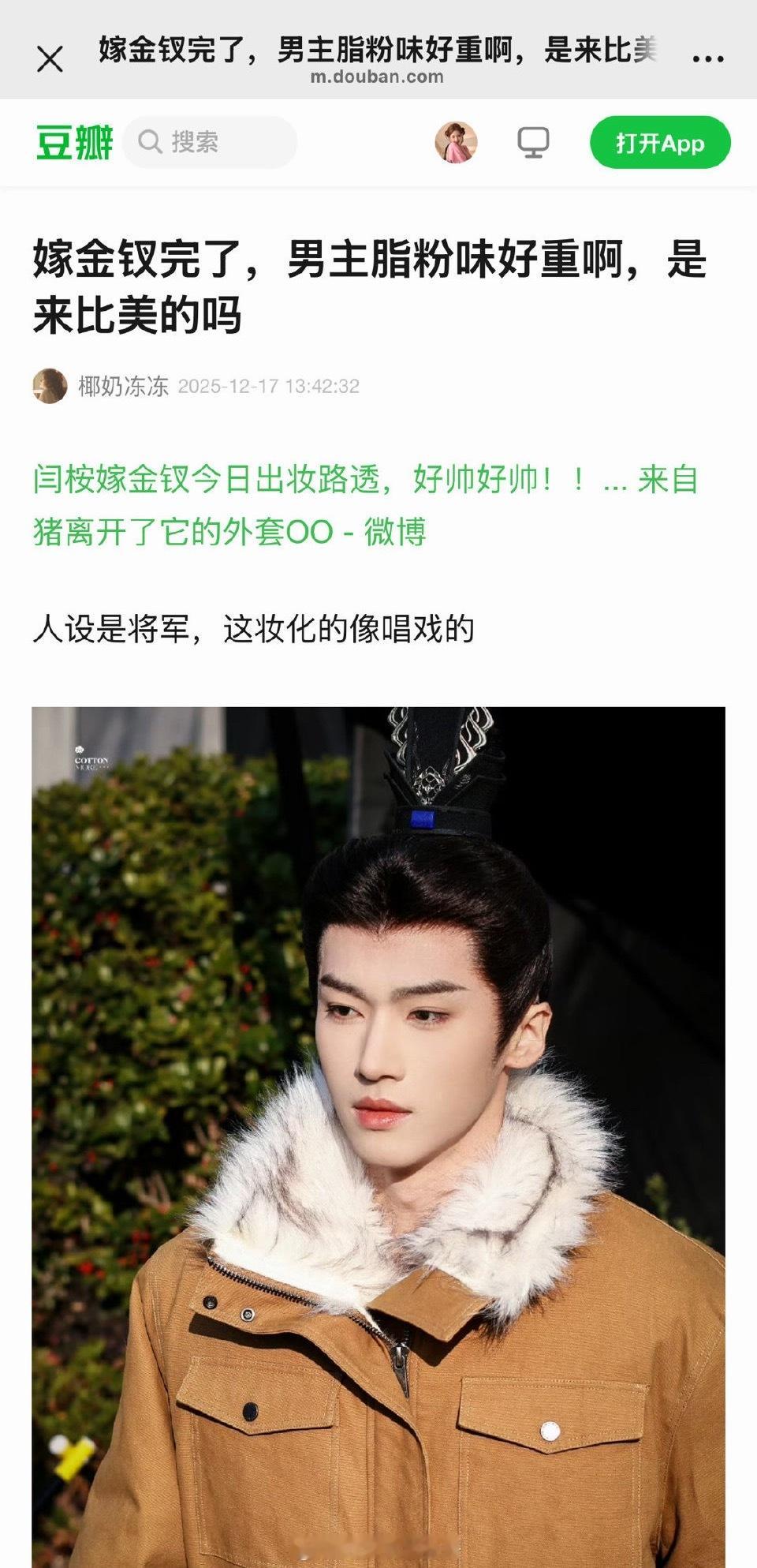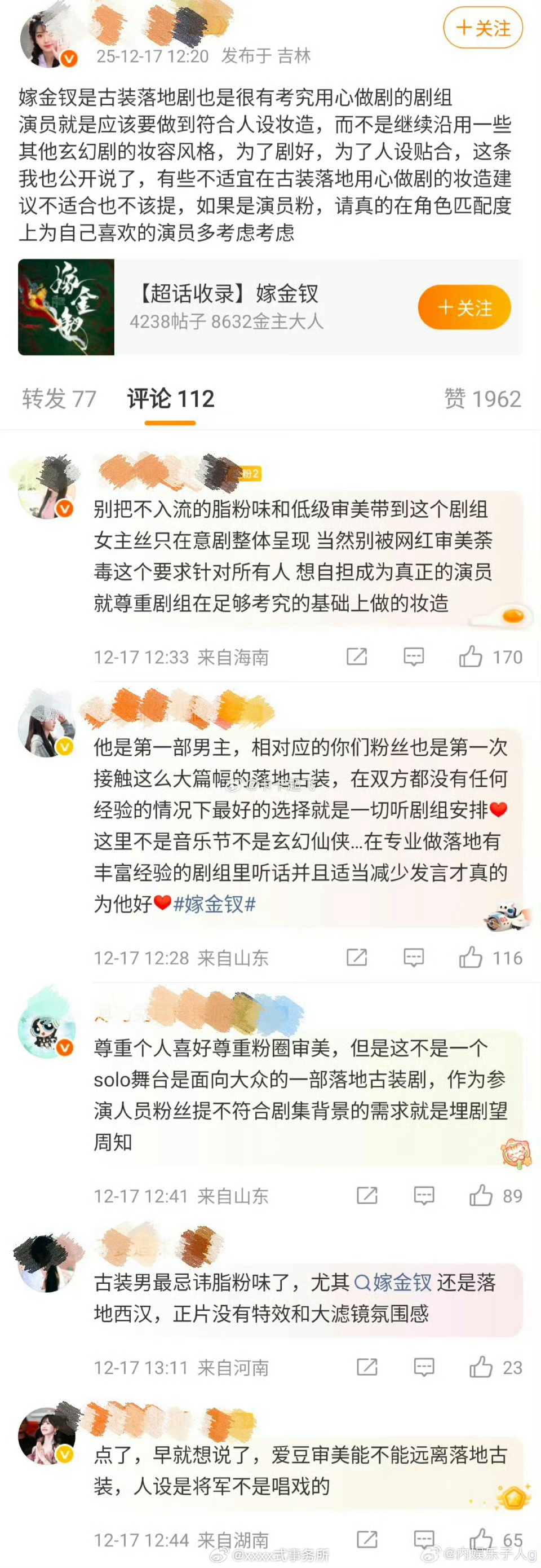 田曦薇粉丝出于为整部剧好的目的,护剧心切提建议,嫁金钗爱豆审美远离落地古装,男主人设是将军脂粉味不能太重