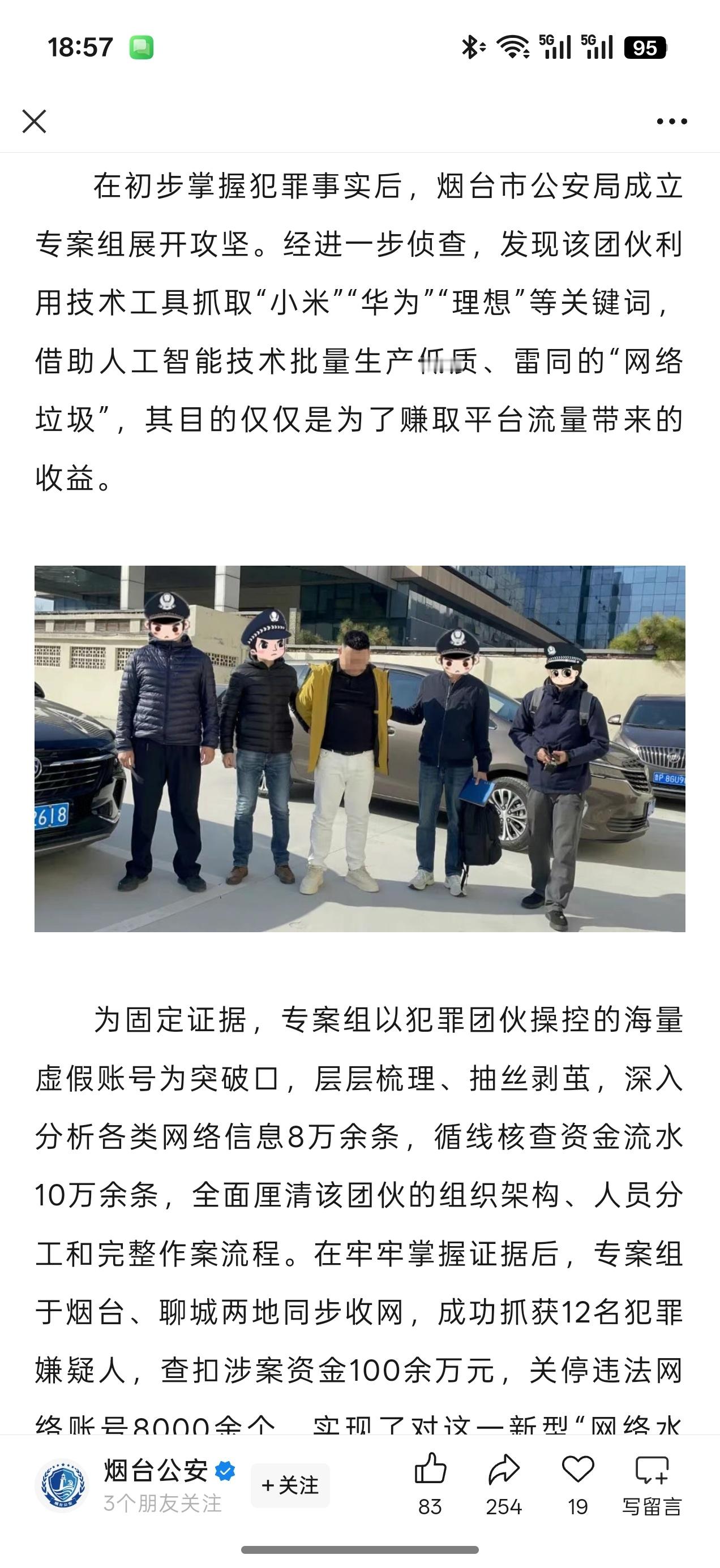 黑产操纵8000余个账号抹黑小米华为理想这想想都可怕,8000多个账号,可以说触目惊心了都,这些账号损害品牌声誉,在网上鱼目混珠,支持烟台公安,像这种产业化用技术手段抹黑企业的黑产团伙就应该重拳出击,其实也提醒大家,对网上的一些评论也要有所思考免得被带偏,不过主要是现在犯罪手法真的太猖狂了,支持严厉打击,重拳出击!