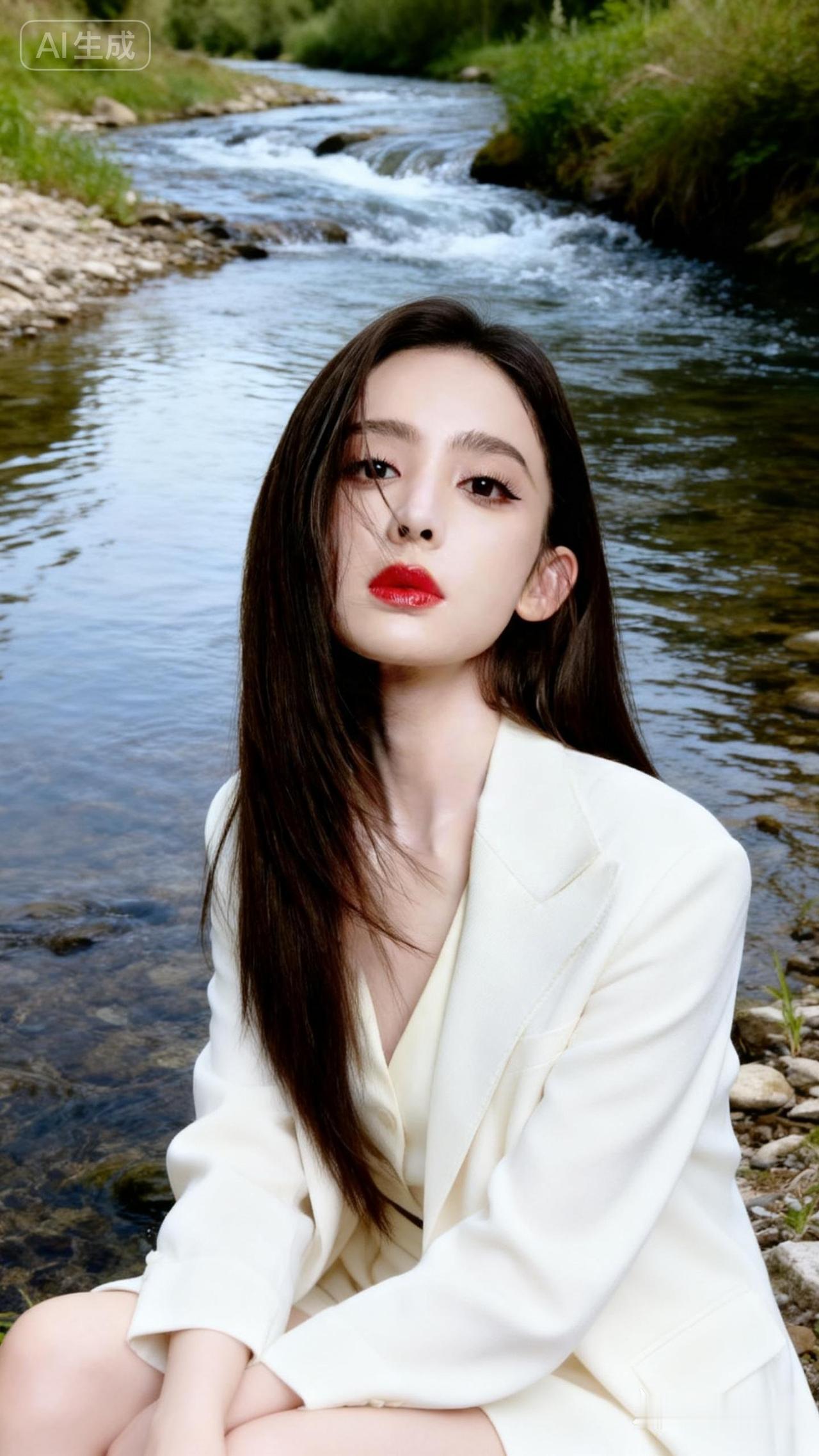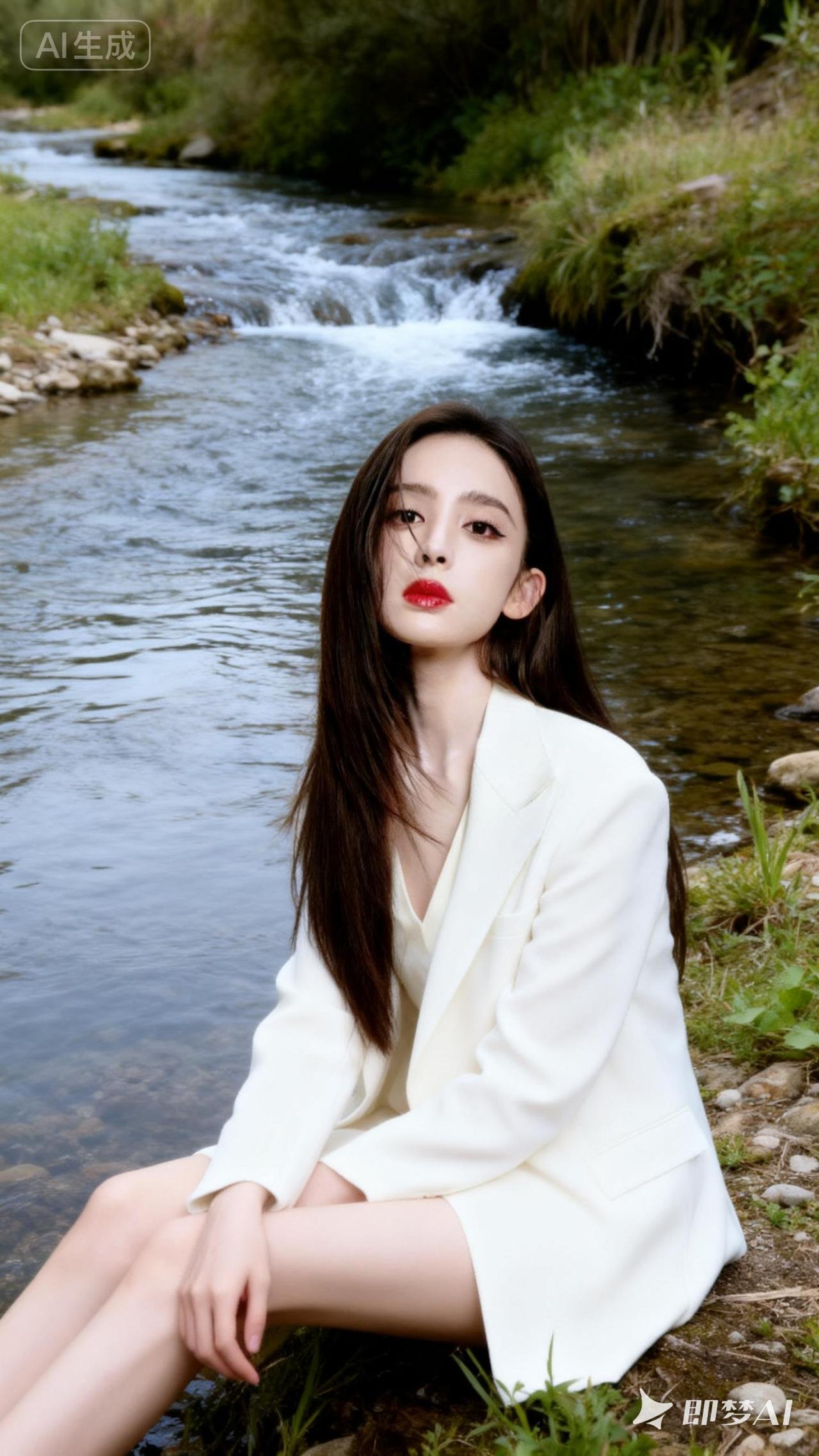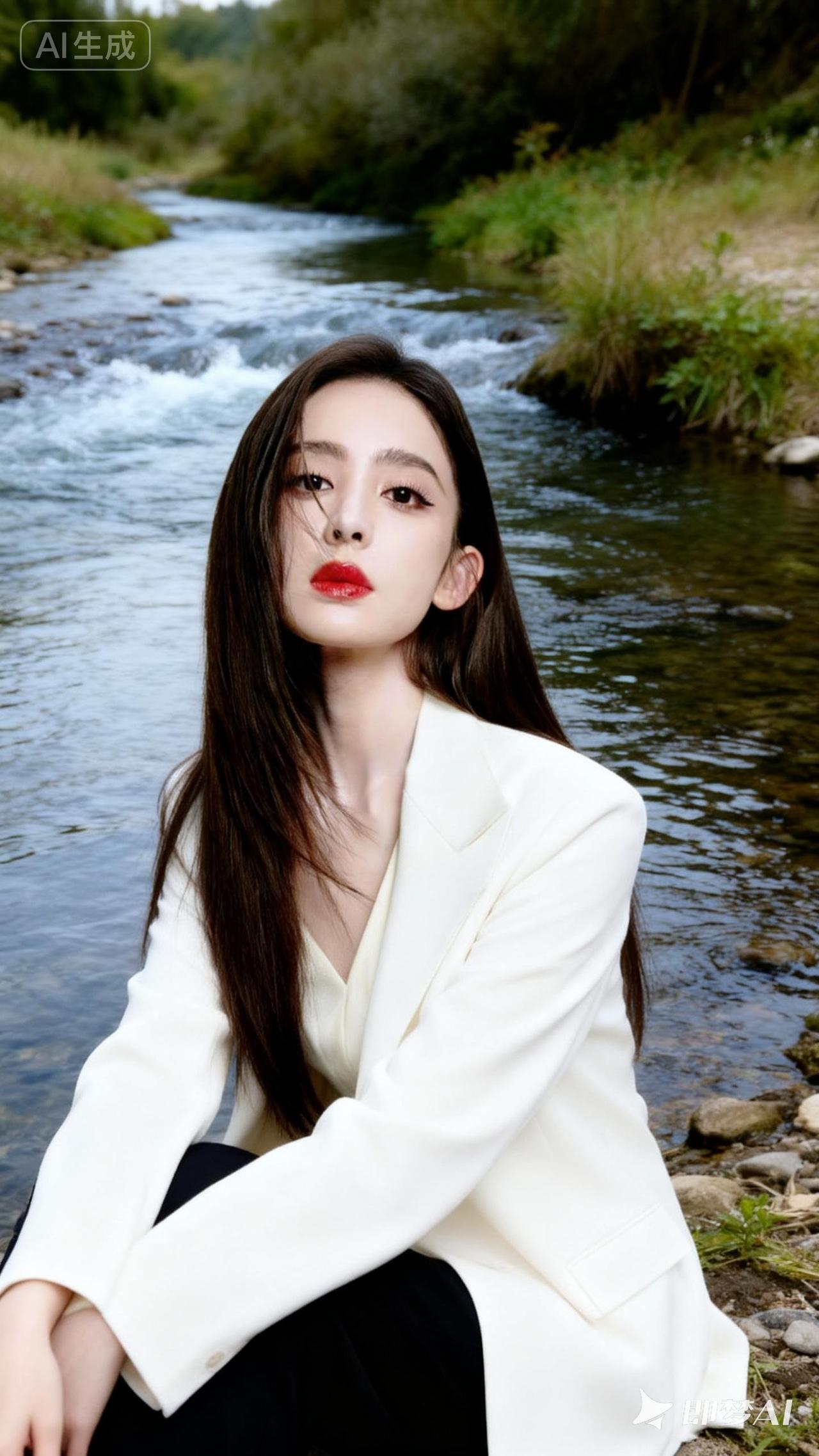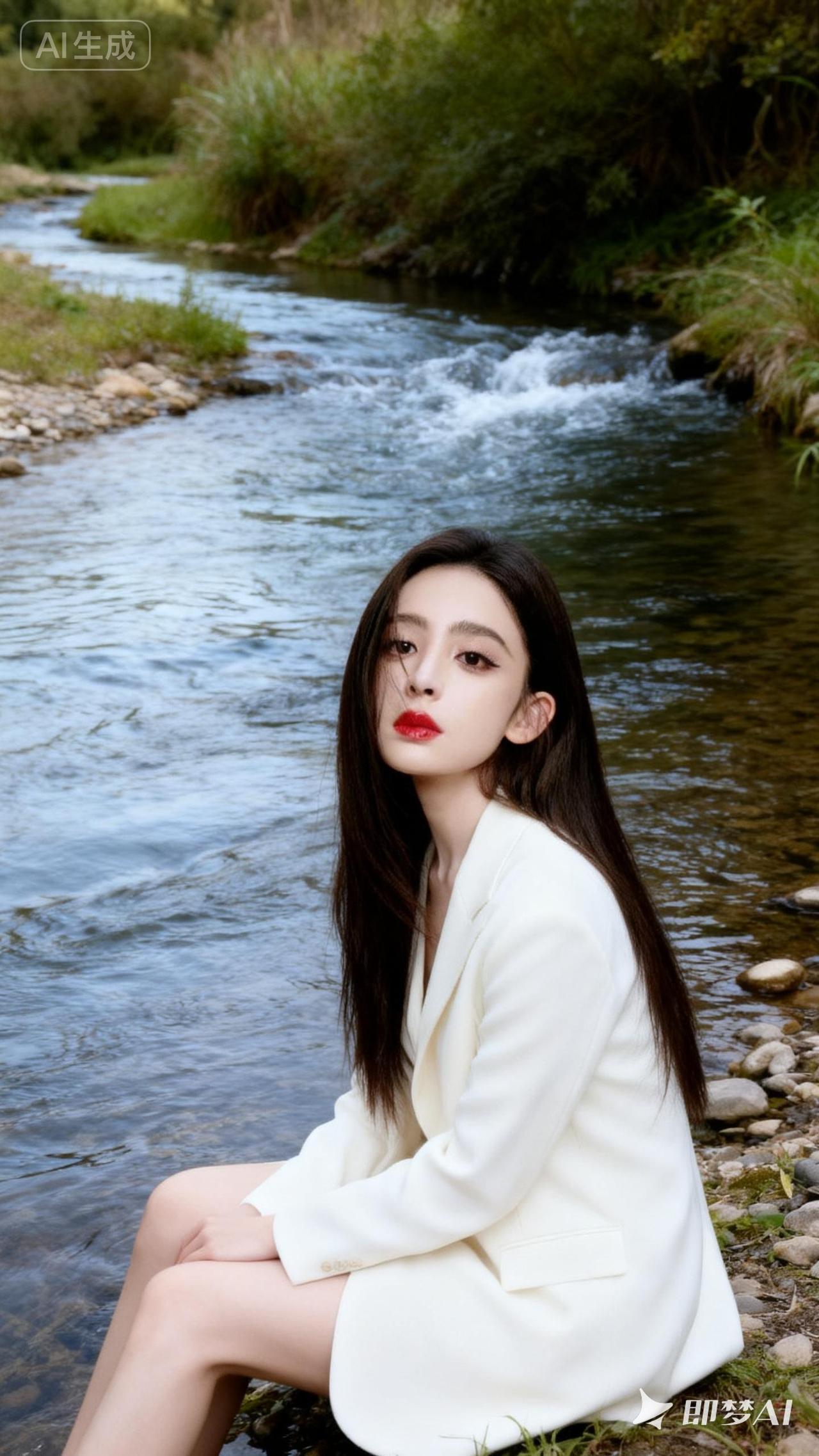 在溪流边,白衣少女静坐,红唇轻启,仿佛诉说着岁月的静好。