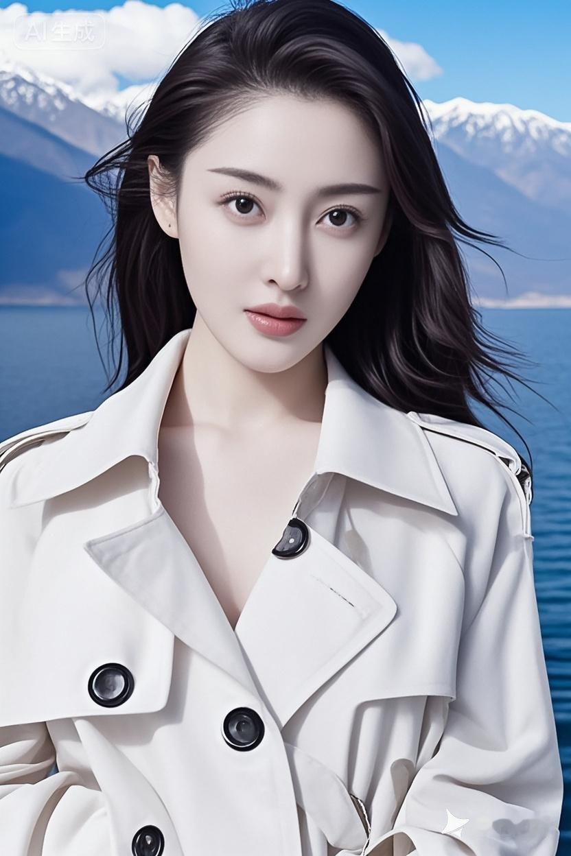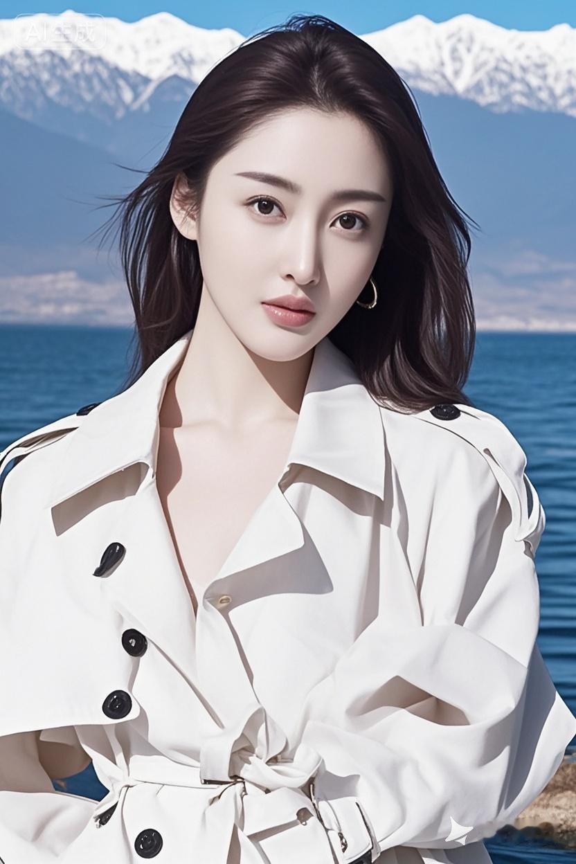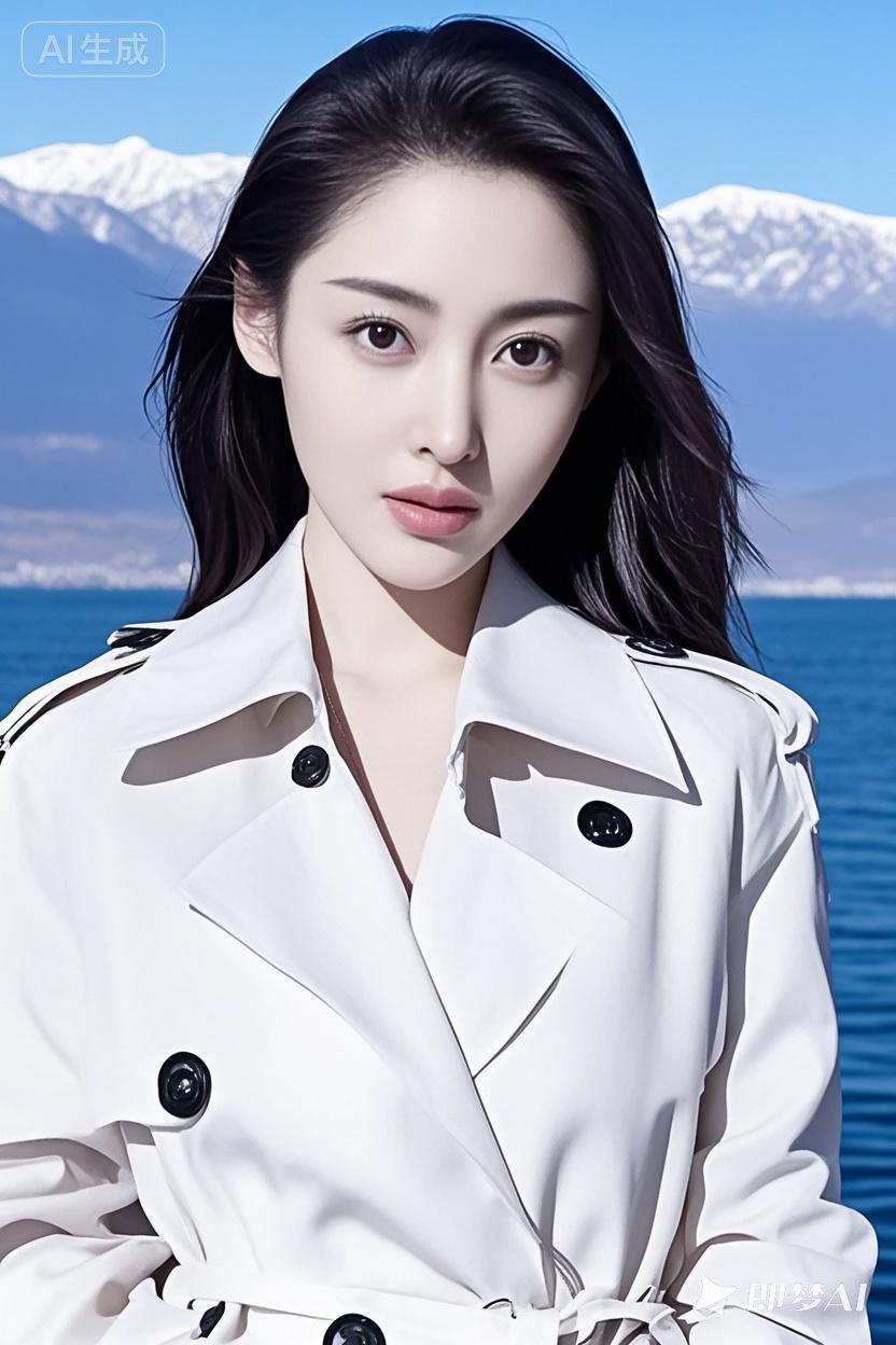 冬日雪景下的优雅女神,白色大衣与黑发相映成趣,宛如童话中的公主。