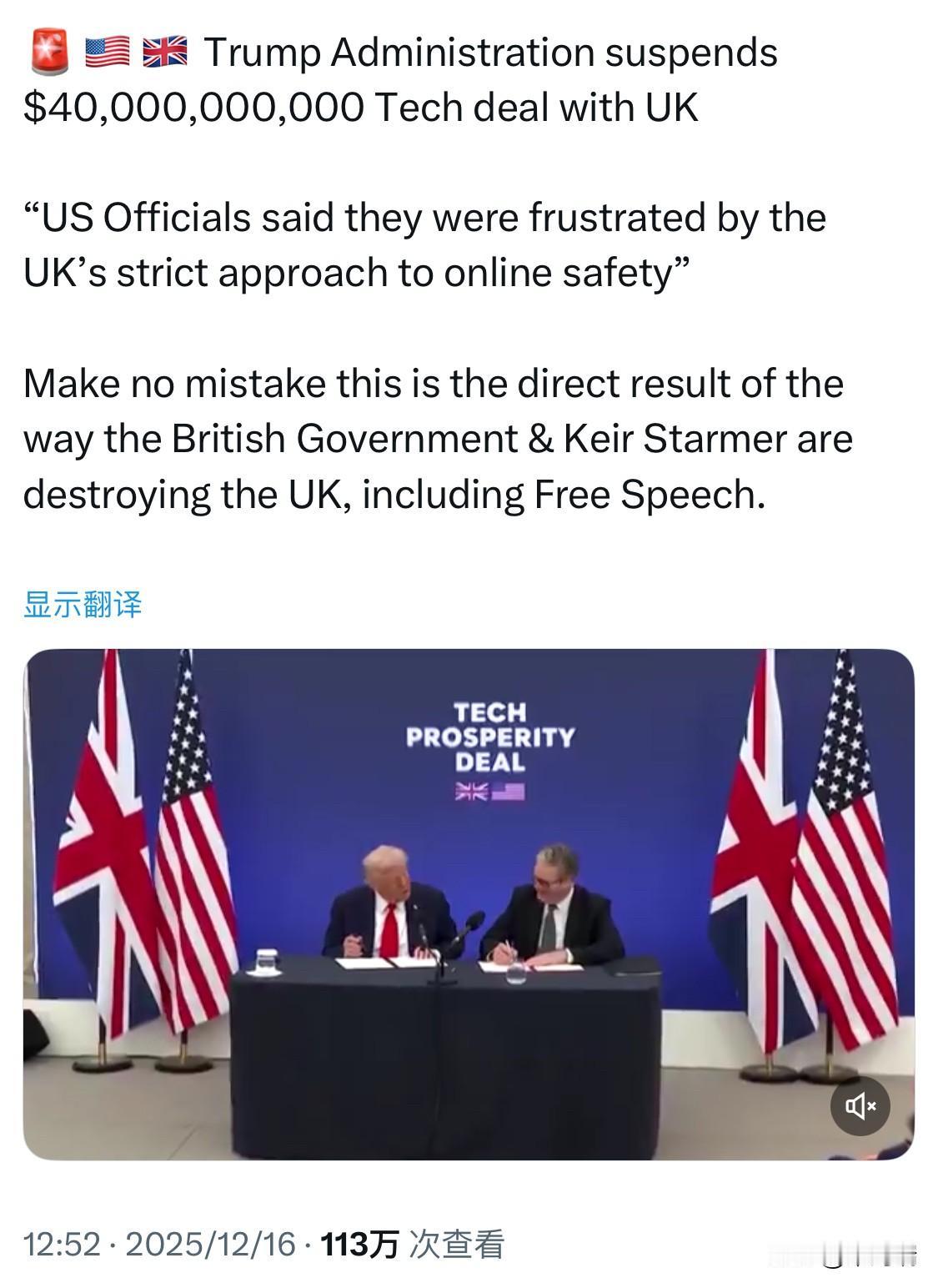 突发消息:特朗普政府已暂停执行与英国达成的价值约400亿美元(约310亿英镑)的《科技繁荣协议》(Tech Prosperity Deal)。 该事件的关键信息如下: 1. 协议背景 签署时间: 2025年9月特朗普访问英国期间,与英国首相基尔·斯塔默共同签署。 涵盖领域: 旨在加强两国在人工智能 (AI)、量子计算、核能以及数字基础设施等尖端领域的合作。 投资构成: 协议包含了美国科技巨头的巨额投资承诺,其中包括微软(220亿英镑)和谷歌(50亿英镑)的投资计划。 2. 暂停原因 美方表示暂停该协议是由于在更广泛的贸易谈判中,对英国的表现感到“日益挫败”: 非关税贸易壁垒: 美国政府认为英国在降低贸易壁垒方面进展缓慢,特别是在食品安全标准(如美国农产品准入)和工业品规定方面拒绝做出让步。 数字服务税: 特朗普政府对英国继续向美国科技公司征收数字服务税表示不满。 谈判杠杆: 观察人士认为,美方将此技术协议作为杠杆,迫使英国在农业、数字监管等关键领域做出更大妥协。 3. 当前进展与影响 英国反应: 英国唐宁街10号表示,两国仍处于“积极对话”中,并对最终达成协议保持信心。 关系裂痕: 此次暂停被视为美英“特殊关系”的一大挫折。此外,近期特朗普还因纪录片剪辑问题向英国广播公司 (BBC) 提起索赔100亿美元的诉讼,进一步加剧了两国关系的紧张局面。 目前,该协议的履行取决于英美双方在2025年5月达成的《经济繁荣协议》框架下能否取得实质性进展。