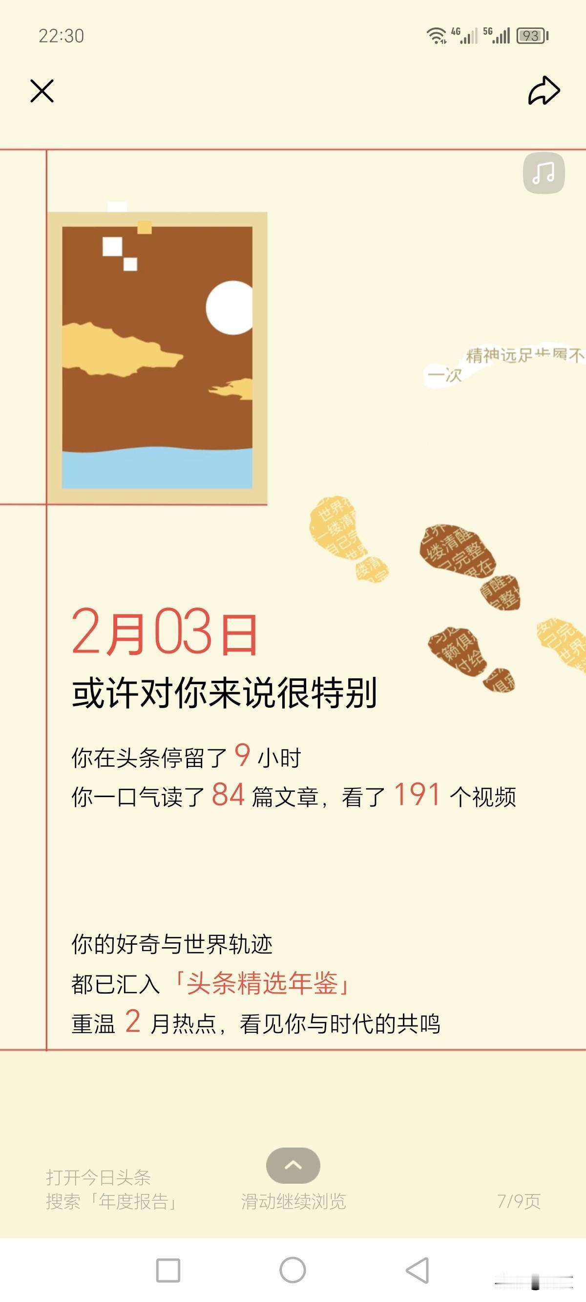 刚刷到有人写头条年度报告。我赶紧去找我的,还真有。点开,原来我2017年就入驻头条了,也写头条3年了。 当然头条的年度报告全是鼓励,让人心里暖,写头条的劲头又增长了许多。 最让我哭笑不得的是2月3日,一天24小时,我在头条待了9小时[泣不成声],一口气读了84篇文章,看了191个视频。 那天可能是春节放假那几天吧,我也是真的彻底放松了,上头条就不回来了。 我也忘了那天头条管没管我饭。[我想静静]