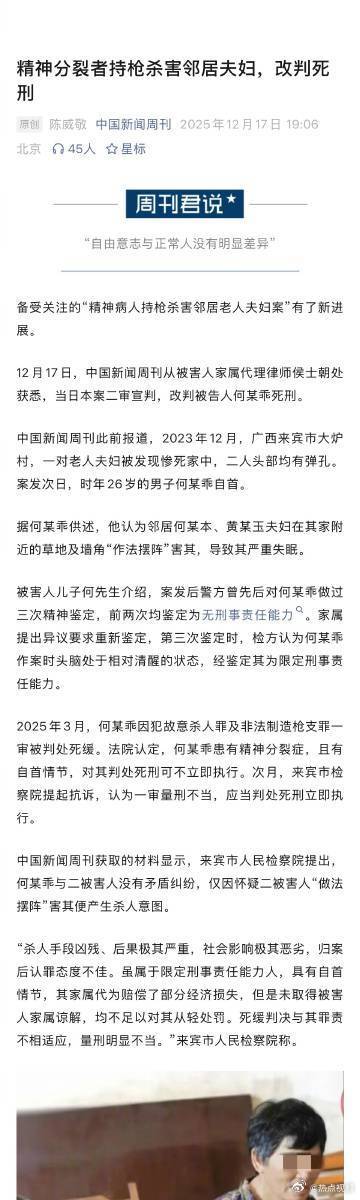 【#枪杀邻居夫妇后男子买3瓶52度白酒自杀#】#男子枪杀1人后踹门射躲避老人头部# 备受关注的“精神病人持枪杀害邻居老人夫妇案”有了新进展。12月17日,从被害人家属代理律师侯士朝处获悉,当日本案二审宣判,改判被告人何某乖死刑。根据二审判决书记载,何某乖自称曾在网上浏览相关施法害人的“邪术”内容,并深信不疑,因长期失眠,怀疑是何某本、黄某玉夫妇在其家附近“摆阵做法”所致。2023年12月4日10时许,何某乖携带两支上好弹药的改装射钉枪进入何某本家客厅,持枪质问何某本,何某本欲从座椅上起身,何某乖认为何某本想抢枪,遂开枪射击何某本头部致当场死亡。何某本的妻子黄某玉闻声从卧室出来查看,见状躲回卧室内并锁上房门,何某乖踢开门,黄某玉跑出来,被何某乖持另一支枪开枪射击头部致当场死亡。事后,何某乖用何某本家的一个编织袋将两支枪装好,关好何某本家的大门,然后驾驶何某本家的二轮电动车把枪藏在附近的一处祠堂里。随后何某乖到来宾市公安局门口欲投案,在门口徘徊一阵后离去。他于是开了一间房间住宿,买了3瓶52度的酒,到房间欲喝酒自杀,但才喝一瓶就喝不下了。他又到超市买了一把小刀回房间,次日醒来后用小刀割自己的左手臂自杀,昏迷醒来后用电话报警投案自首。“精神疾病对其(何某乖)在作案时的辨认和控制能力没有明显影响,不足以对其从轻处罚,对其判处死刑立即执行更能体现罪责刑相适应的原则。”广西高院在判决书中写道。(中国新闻周刊)