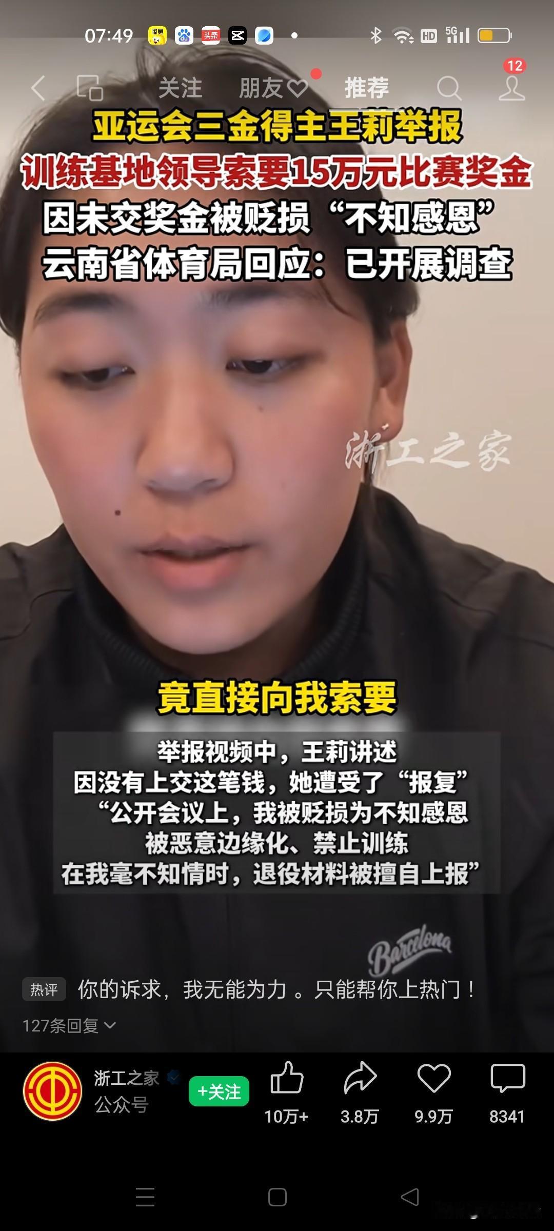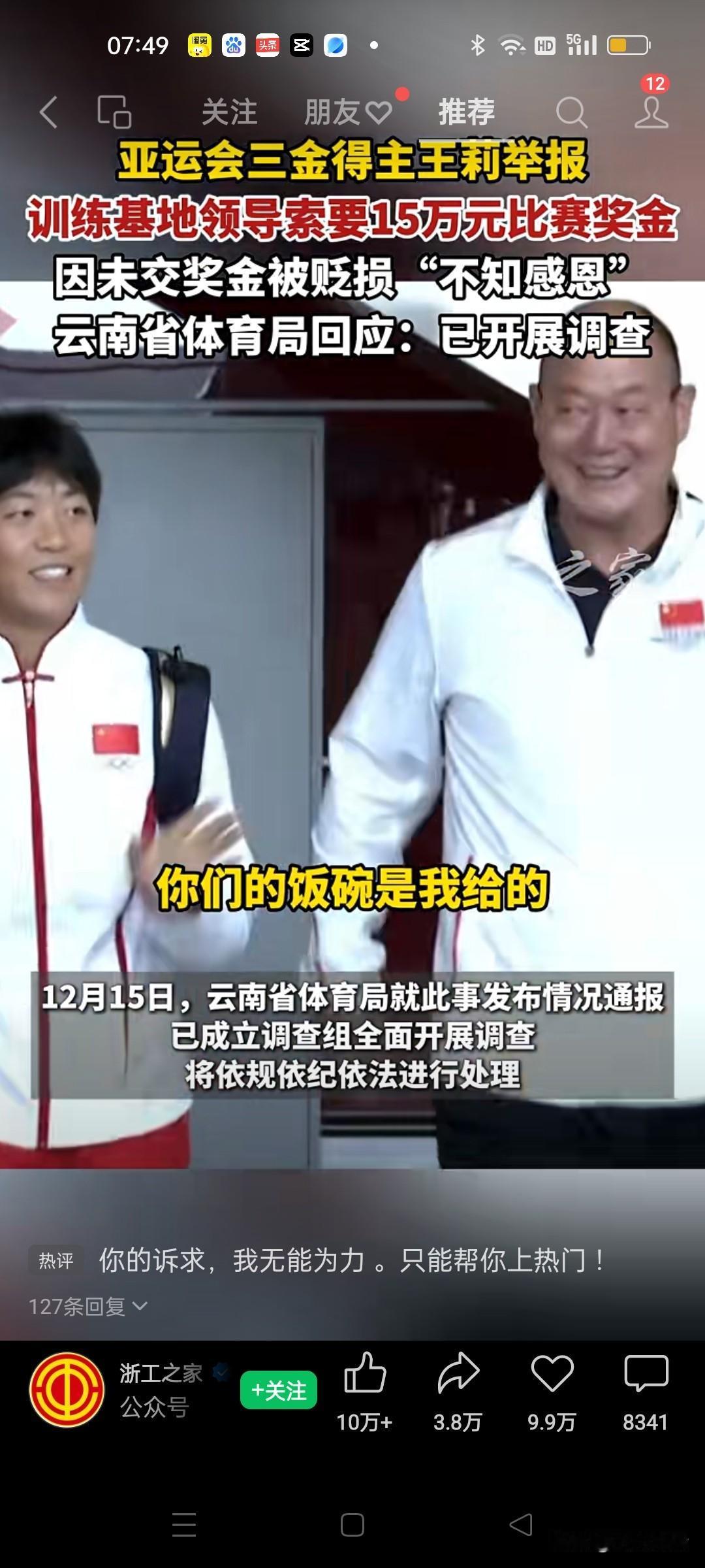 云南省体育局这事儿 终于采取措施了,行动也快。 被举报的那个范某文停职了,体育总局督导组空降,这一系列动作真的很解气。 仔细琢磨领导向运动员索要奖金的事,真是让人后背发凉。昨天也看到另一个运动员发文声援王莉,称自己也曾经被领导索要奖金未果被逼退役的事。这说明体育界的黑料不是个别现象,也许普遍存在。足协的腐败也算是其中之一了。 第一次听说教练居然还能理直气壮地向运动员张嘴索要得奖奖金15万,这是把运动员当成了自己的摇钱树。觉得运动员拿金牌就是训练基地领导的功劳,既然这样。领导为啥不自己去参加比赛夺金牌呢? 现在好的是网络发达,某些坏人的遮羞布已经遮不住了,只有网上实名举报,把锅底的灰亮出来让人都看看。 运动员实属不易,放弃学业就趁着年轻那十来年时间打拼,一到年龄退役后几乎与体育赛事告别了,有的退役运动员退役后生活都是问题,不得不卖掉金牌🥇度日,比如像陈晓敏,艾冬梅,邹春兰等曾经的金牌运动员。 希望体育总局一竿子插到底,严查此事,不要让体育事业烂透伤了运动员的心!
