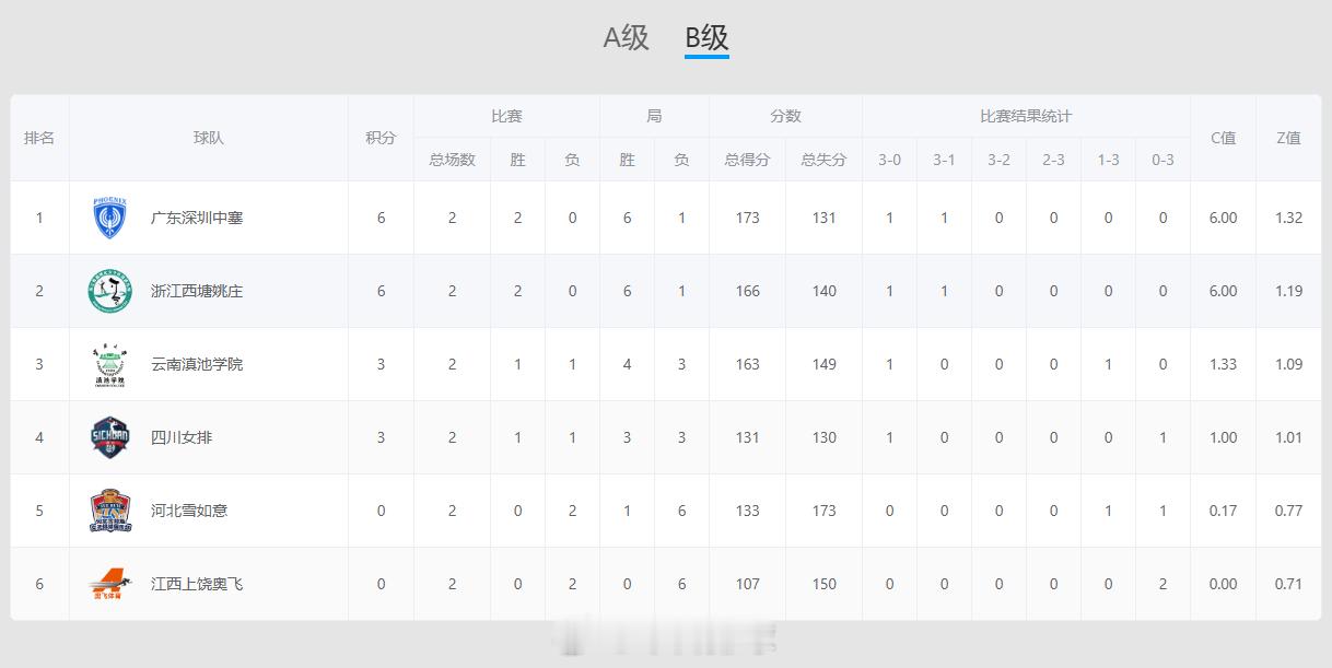 2025-2026中国女排超级联赛 A、B级常规赛两轮过后,各自的积分排名。