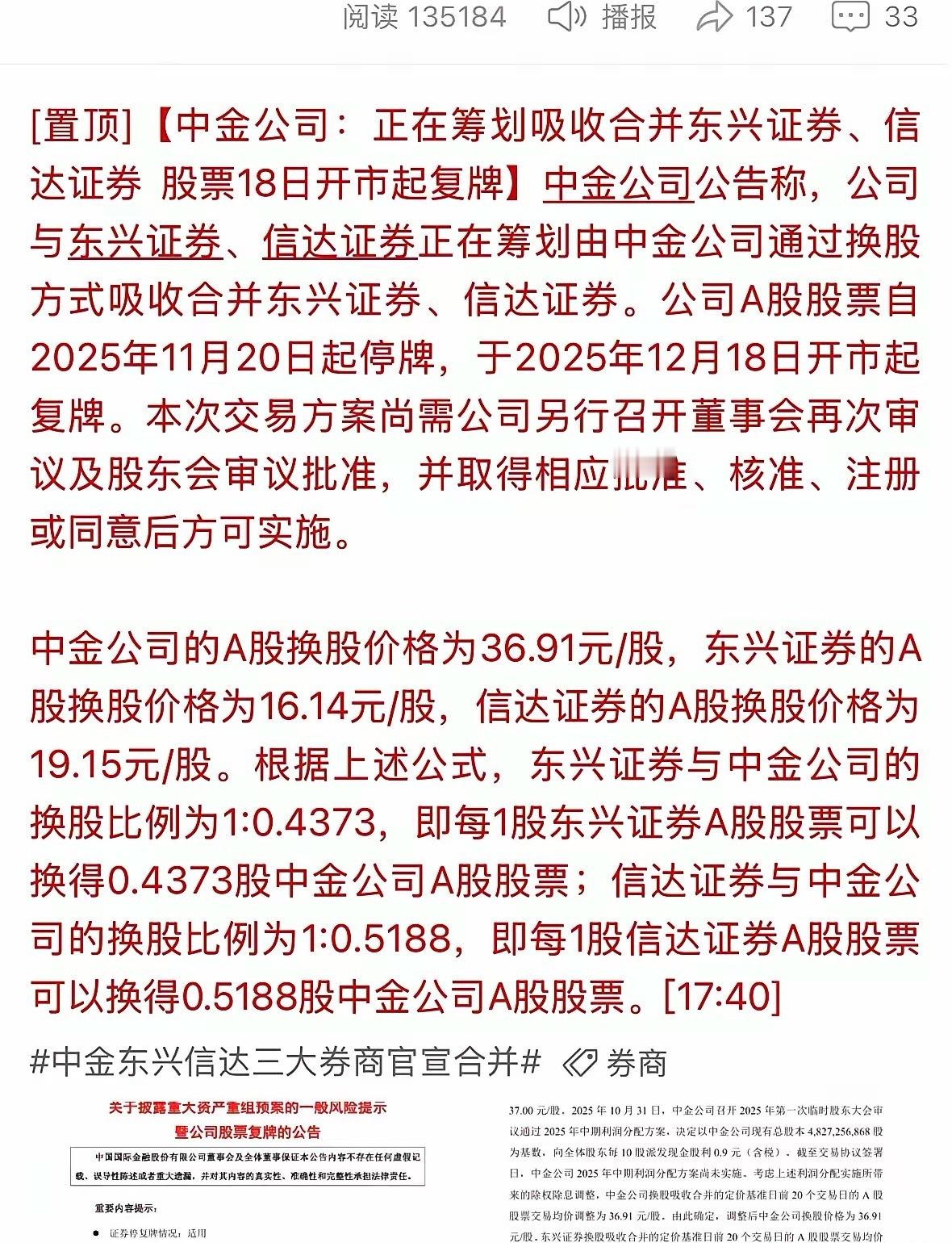 明天打爆空头?证券巨无霸重组成功,明天复牌,明天怎么走?中金公司:正在筹划吸收合