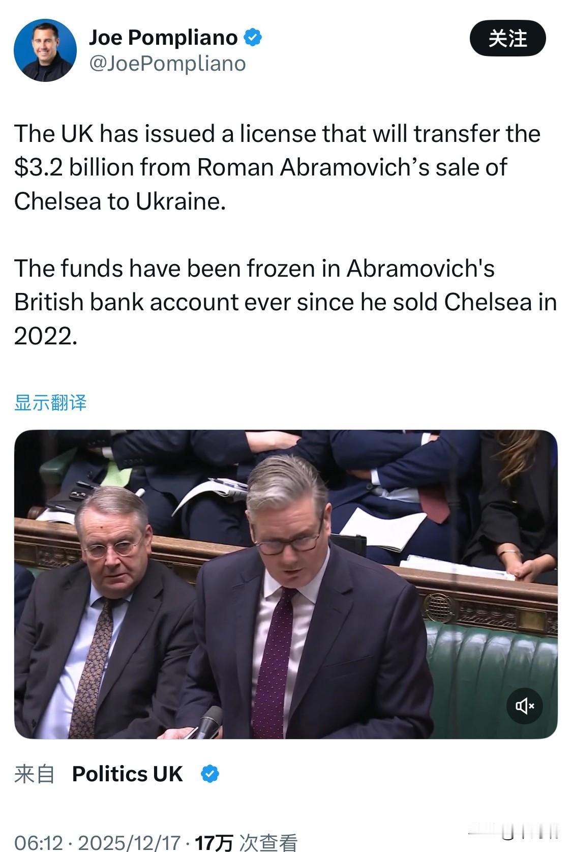 英国政府正采取行动,强制俄罗斯寡头罗曼·阿布拉莫维奇(Roman Abramovich)将其出售切尔西足球俱乐部所得的 25 亿英镑(约 32 亿美元)转交给乌克兰用于人道主义援助。这笔钱自 2022 年切尔西出售以来一直被冻结在英国的一个银行账户中。 核心信息 当前进展: 英国首相基尔·斯塔默(Keir Starmer)在议会质询时宣布,英国政府已颁发许可证,允许这笔资金转移。 资金归属: 根据英国政府的要求,这笔钱必须专门用于乌克兰境内的人道主义事业。 分歧点: 阿布拉莫维奇方面曾表示,希望将资金用于包括俄罗斯境内在内的“所有受害者”。英国政府拒绝了这一提议,坚持资金只能用于乌克兰。 最后通牒: 英国政府给了阿布拉莫维奇 90 天的“最后机会”自愿转账,否则将考虑采取法律行动来强制执行。