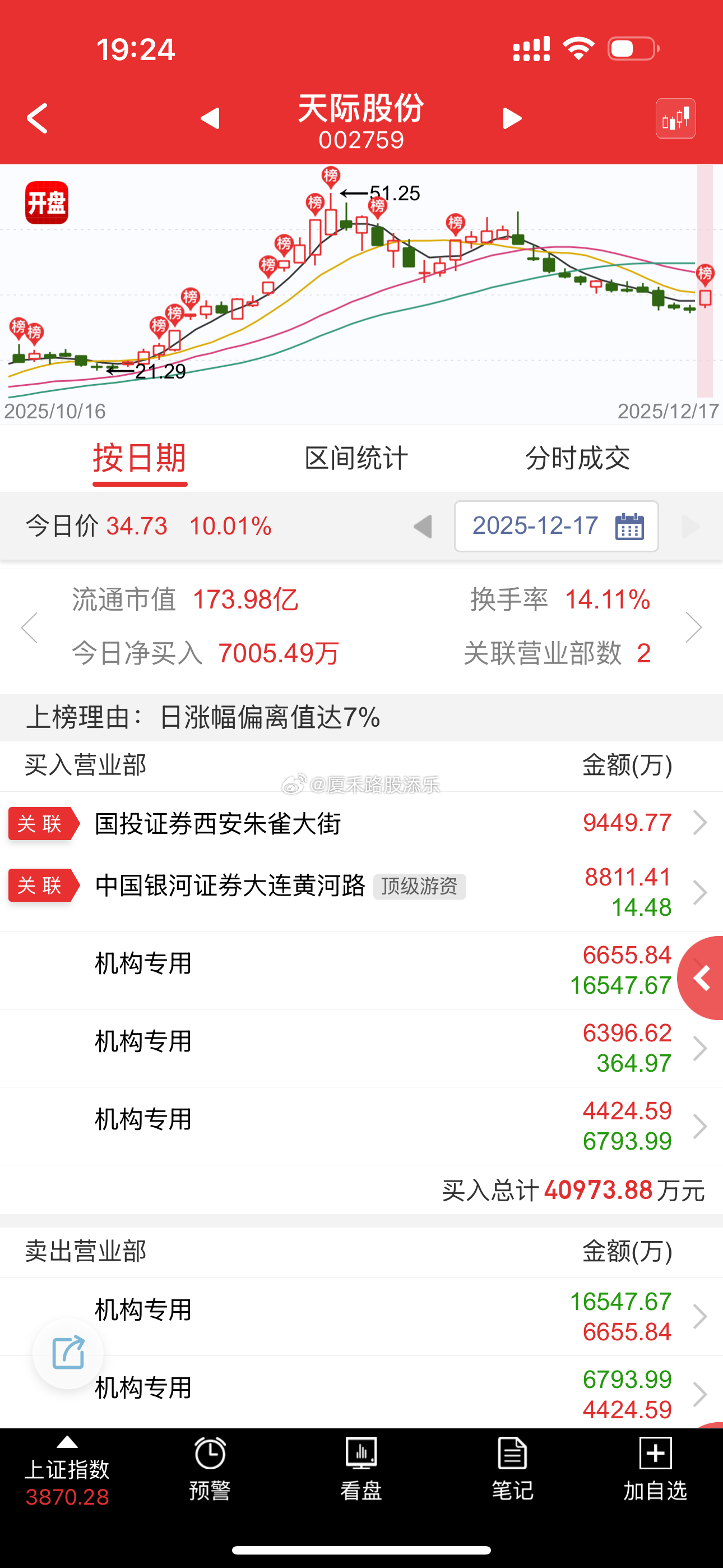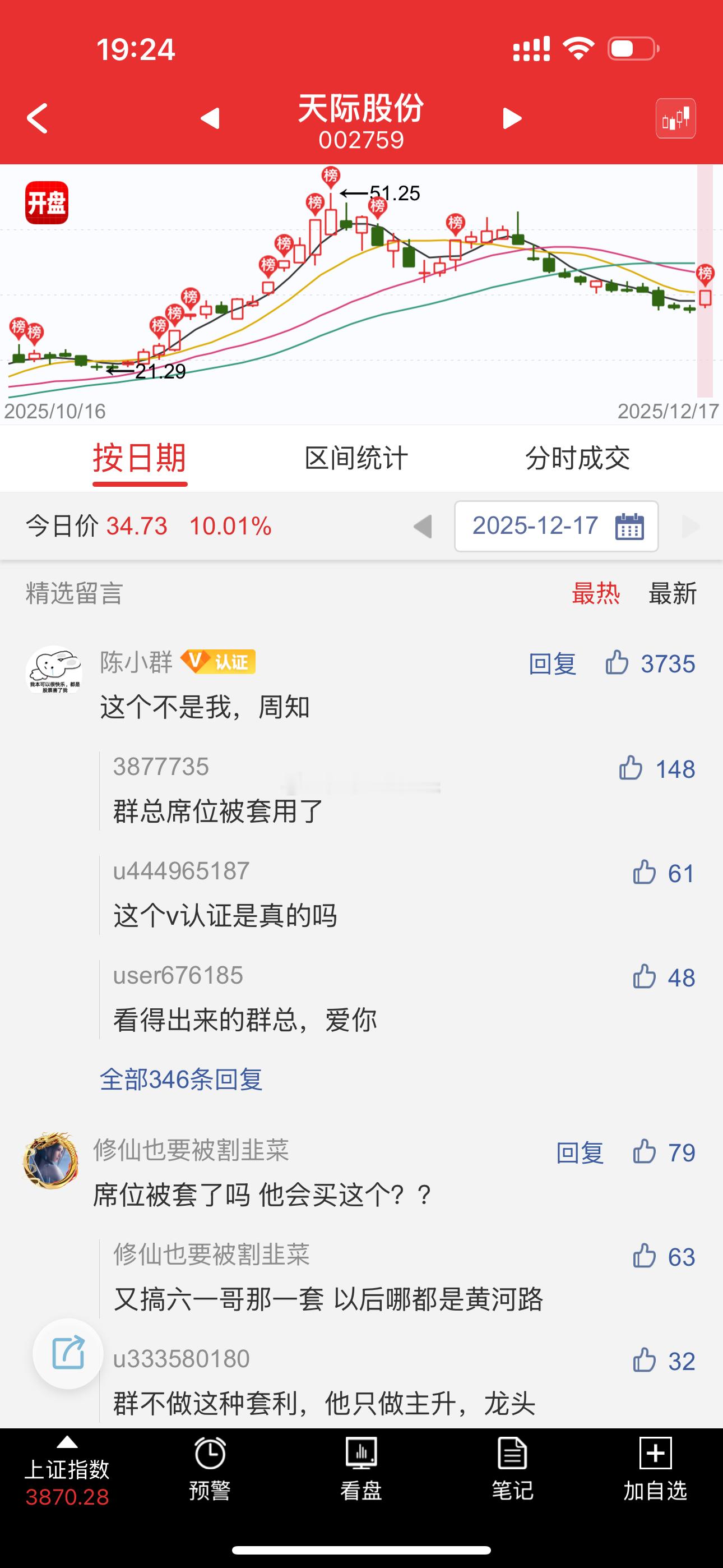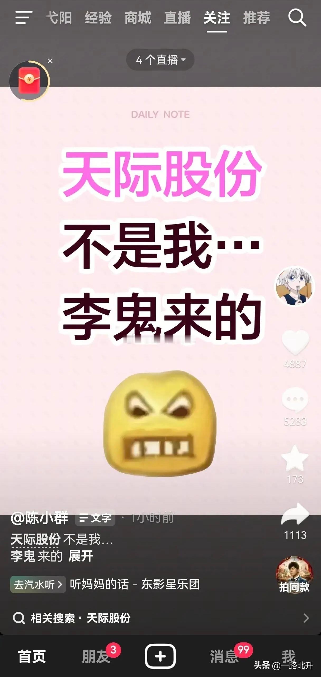 陈小群辟谣了,怎么可能打首板?盘后龙虎榜显示,天际,中国银河证券大连黄河路买入8800W,我下午还在纳闷,群总,作为龙头选手,怎么可能会去打一个超跌的首板呢?果然,人家已经发文澄清了,抖音也澄清,开盘啦一个认证的账户也澄清了。其实,舒服他风格的都知道,压根也不是他的风格,龙头,核心辨识度,主线龙头,才会是他的首选~!