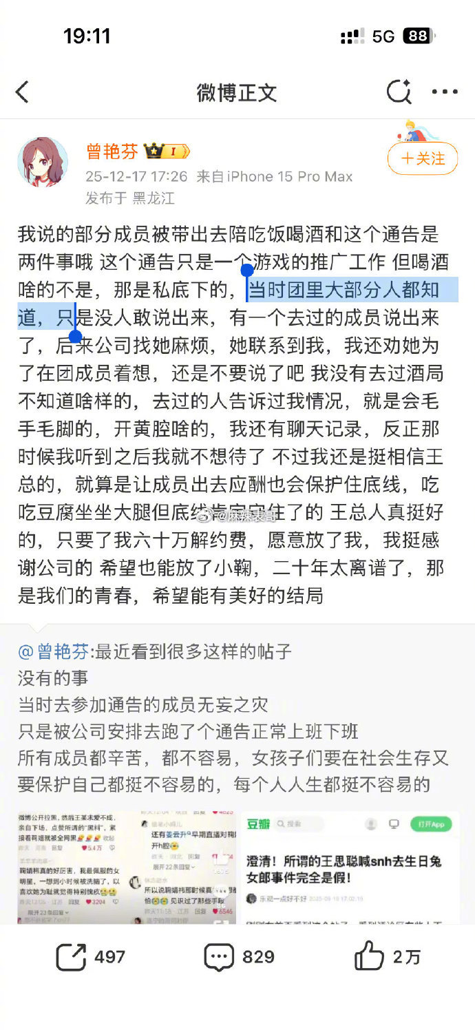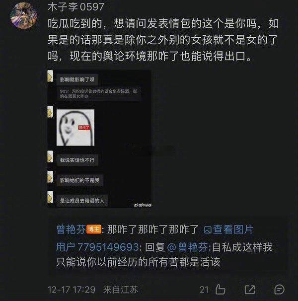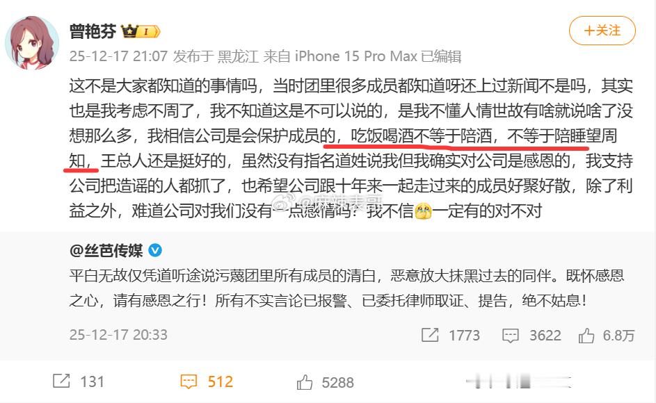 丝芭传媒说要起诉曾艳芬后,曾艳芬开始阴阳怪气,说“吃饭喝酒不等于陪酒,不等于陪睡望周知”“是我考虑不周了,我不知道这是不可以说的”