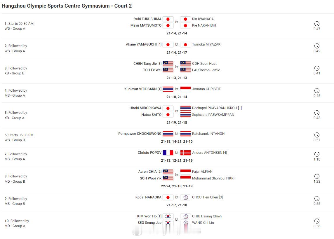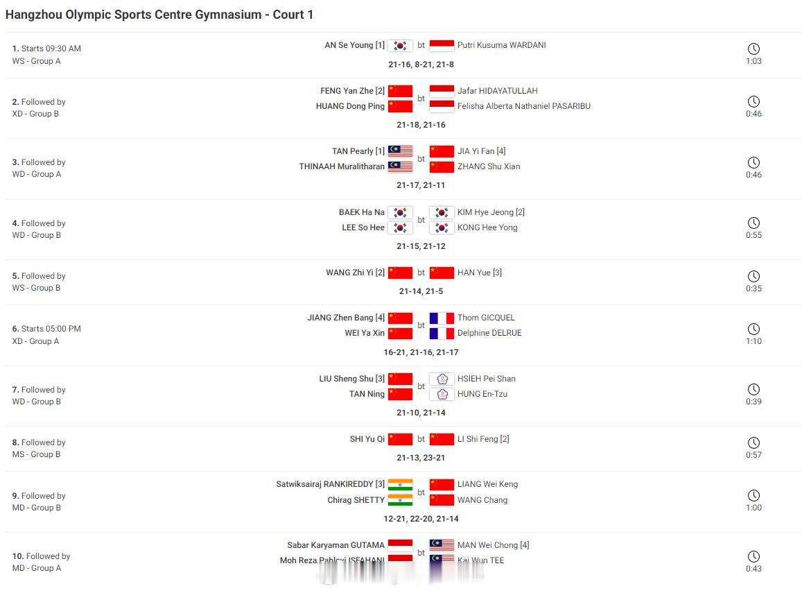 【羽联总决赛首日国羽5胜4负】2025年世界羽联年终总决赛 羽联超级赛12月17日杭州,2025世界羽联巡回赛总决赛小组赛首日,国羽5胜4负。国羽赛果如下:男单:石宇奇21-13/23-21李诗沣女单:王祉怡21-14/21-5韩悦男双:梁伟铿/王昶21-12/20-22/14-21兰吉雷迪/谢蒂(印度)女双:刘圣书/谭宁21-10/21-14谢沛珊/洪恩慈(中国台北)贾一凡/张殊贤17-21/11-21陈康乐/蒂娜(马来西亚)混双:冯彦哲/黄东萍21-18/21-16希达亚图拉赫/帕萨里布(印尼)蒋振邦/魏雅欣16-21/21-16/21-17吉奎尔/德尔鲁(法国)