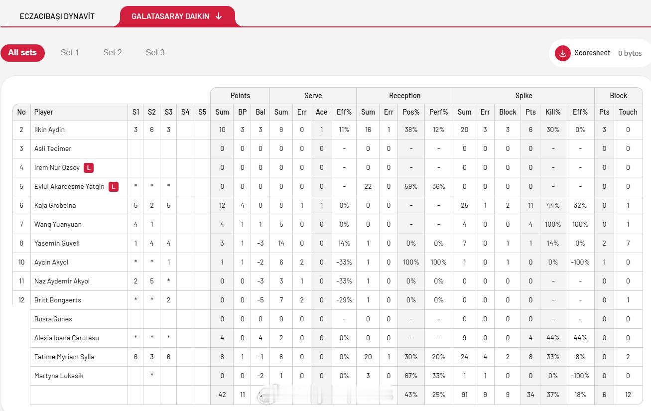 【土超女排加拉塔塞雷0-3伊萨 王媛媛2局4分】国际排坛战报速递中国排球留洋动态 12月17日伊斯坦布尔,土超女排第12轮焦点战,排名第三的加拉塔萨雷客场0-3(23-25/17-25/21-25)被排名第四的伊萨奇巴希零封,格罗贝尔纳12分、伊尔金10分、王媛媛打了前两局得到4分(4扣4中),卡拉库尔特16分、雷特克12分、斯蒂西亚克11分。
