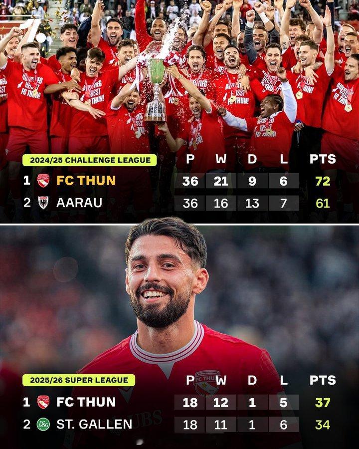 【欧洲最大黑马球队】上赛季瑞士甲(第二级别)联赛冠军,本赛季瑞士超升班马图恩(FC THUN),开季前18轮联赛拿下12场胜利,包括战胜了苏黎士、圣加仑和塞尔维特等知名球队,暂时排名联赛积分榜榜首,领先3分。接下来球迷可以留意一下,“凯泽斯劳滕神话”会不会瑞士超上演?