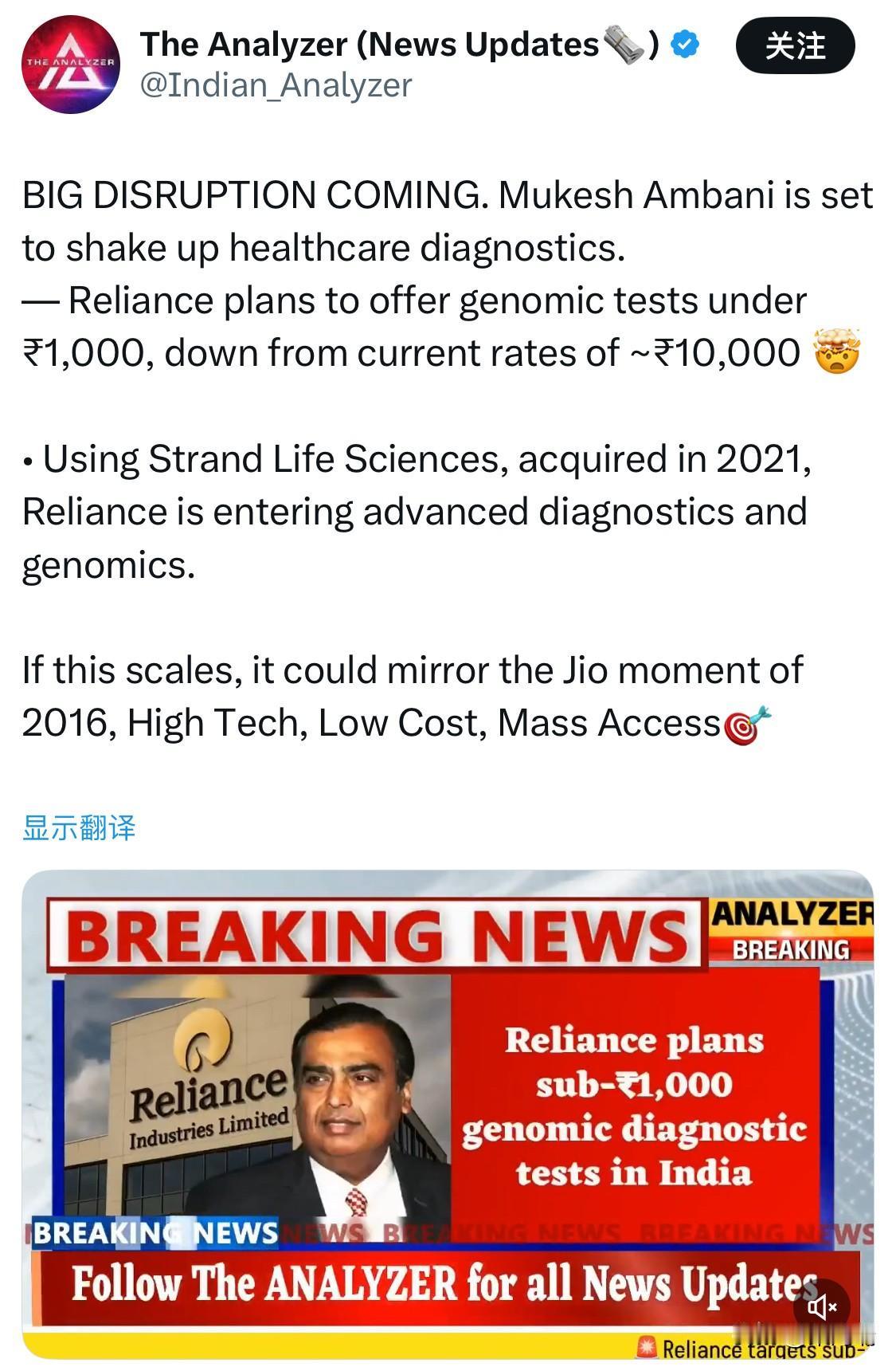印度首富,印度信实工业掌舵人穆克什·安巴尼(Mukesh Ambani)准备彻底改变医疗诊断行业。 — 印度信实工业(Reliance)计划将基因组检测的价格降至1000 ₹以下,低于目前的10000 ₹。这种定价策略类似于 Reliance 在 2016 年通过 Jio 进入电信市场时引发的“Jio 时刻”,旨在实现高科技、低成本和大众普及。 Reliance 正在利用其在 2021 年收购的班加罗尔基因组学和诊断公司 Strand Life Sciences 来推动这一举措,进军先进诊断和基因组学领域。 测试内容: 基因组测试分析 DNA,以提供疾病风险(如癌症、心脏和神经退行性疾病)、遗传条件和个性化治疗方案的关键见解。