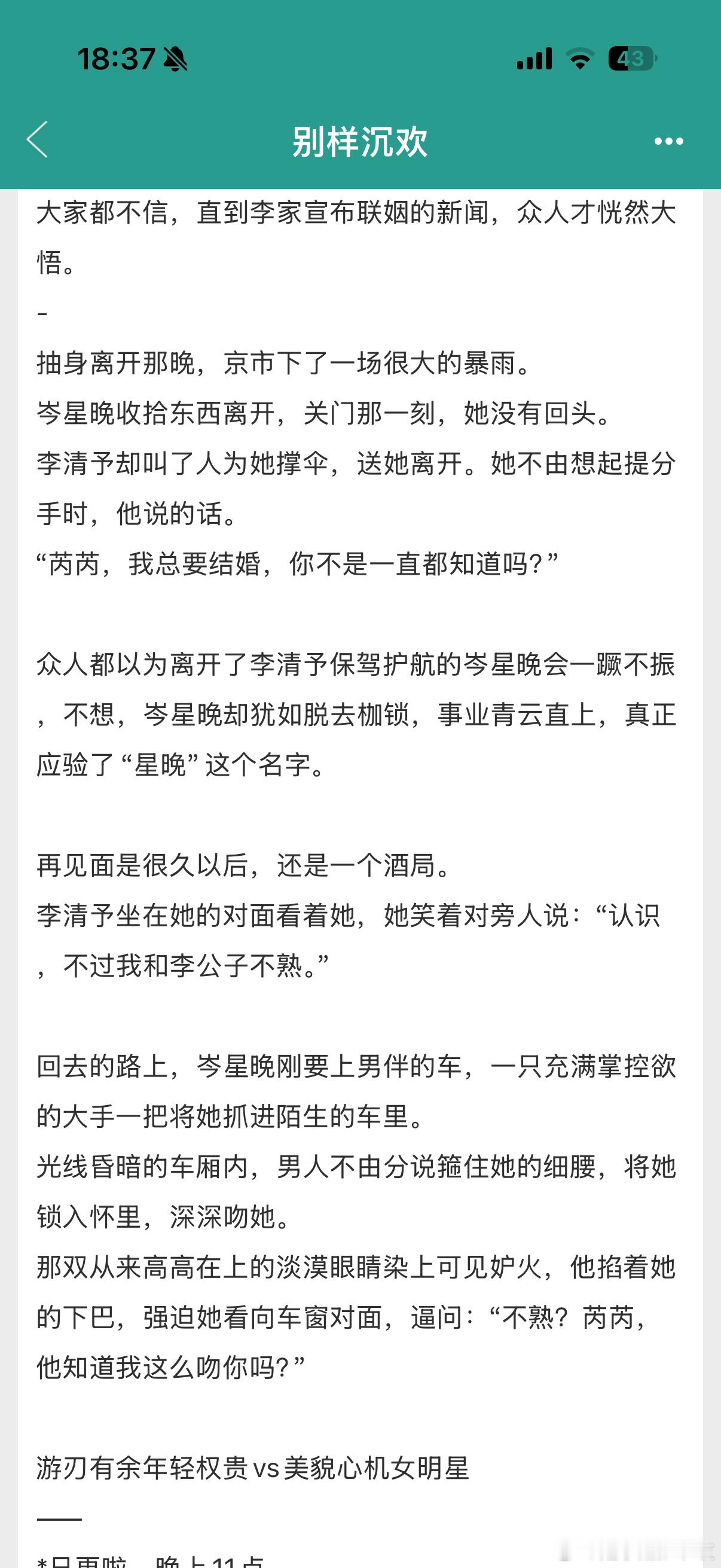 《别样沉欢》by玉陵游京圈高干/破镜重圆/追妻/正文完结这本清冷心机女明星x温柔京圈贵公子的古早味高干文,居然让我熬到现在!顶级身份差+极致推拉太好看了!高干文追妻言情小说推荐推文久别重逢