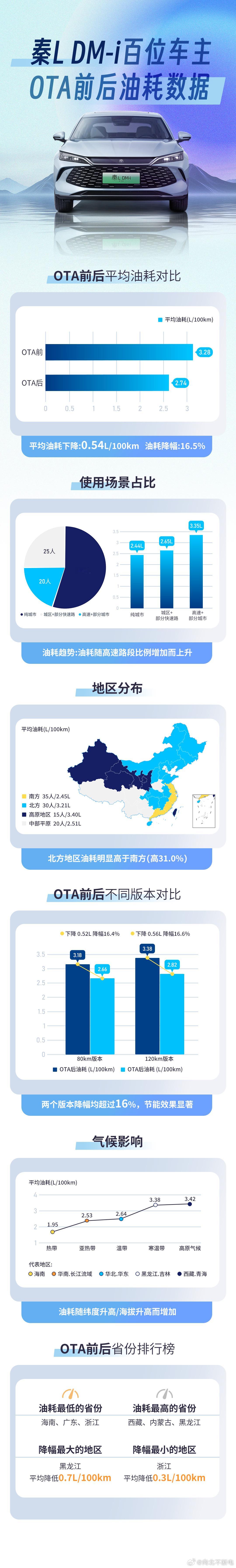 10月中旬我 征集了秦L百位车主数据,现在终于给大家整理好了,足足找了100名真实的车主。有长期处于亏电状态的、有偶尔充电的、有尽可能用电的,区域也覆盖了祖国的绝大多数地区,有严寒的东北、有高海拔的云贵川、也有平原和相对温暖的南方等等,给大家汇报一下:①先说结论,OTA后车主油耗平均下降了0.54L/100km,幅度大约为16.5%,还是非常显著的;②第五代DM的绝对甜点区在纯城市道路,平均油耗低至2.44L/100km,高速场景越多,相对来说油耗也会增加;③从地区分布来看油耗,南方地区<中原地区<北方地区<高原地区;④本次样本里,油耗最低的城市省份为海南、广东和浙江,最高的省份为西藏、内蒙古和黑龙江;⑤影响秦L DM-i油耗的主要因素是气候温度>电池工况>地形海拔>交通拥堵情况。低温是油耗的“第一杀手”,发动机需要时刻维持工作温度,而高海拔也会显著增加工作负荷,从而提升油耗;⑥OTA后降幅最大的地区为黑龙江,平均下降了0.7L/100km,推测可能是整体热管理有了更好的表现通过相对充足的数据支撑,我们基本可以得出明确的结论,第五代DM的油耗优化并非噱头,而是实打实的服务了用户。