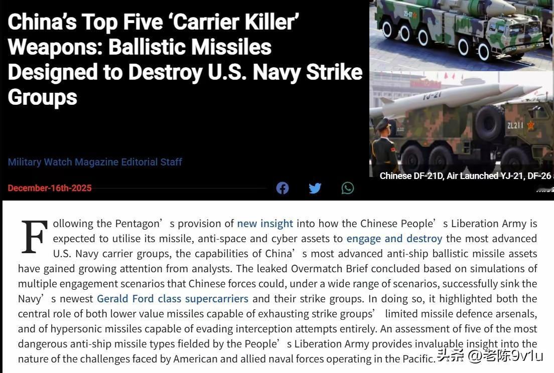 美媒列举中国五大航母杀手却 忽略鹰击19 美媒列举中国五大“航母杀手” (东风27、26D、21D、舰载及 空基鹰击21),却忽略威胁最大的鹰击19;这些武器尤其是高超声速的对美航母致命,而美军LRHW战斗部仅13千克,难“以攻对攻”。 na's Top Five 'Carrier Killer apons: Ballistic Missiles igned to Destroy U.S. Navy Strike
