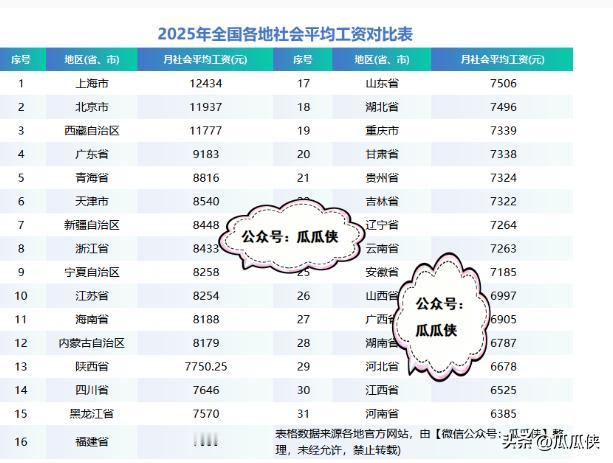 新鲜出炉2025年全国各地社会平均工资排行榜,快来看看你是 “平均之外” 拖后腿的大多数吗? 盯着这份全国 31 省月均工资表,我心态崩了。 上海 12434、北京 11937 霸占前二不意外,可西藏 11777 紧随其后排第三?反观河南 6385 垫底,比云南、贵州还低一截。更扎心的是,我本科毕业干了十几年,月薪 6000 出头,在公司里比大半同事的 3000、4000 块还高,本有点小优越感,结果连全国倒数第一的平均工资都没摸到。 这工资排名简直颠覆认知,咱们一步步捋。 第一梯队毫无悬念是京沪藏。 上海 12434 元的月薪,配得上魔都的物价和节奏,写字楼里的白领熬夜加班,挣的就是这份辛苦钱。北京 11937 元紧随其后,皇城根下的就业机会多,高薪岗位也密集,这个数字算实至名归。 最让人意外的西藏 11777 元,别光羡慕,这背后藏着政策倾斜的门道。高海拔地区有专项补贴,而且统计数据里机关事业单位、国企占比超 60%,私营单位占比低,不像内地私企拉低平均值,再加上国家转移支付的补偿效应,工资自然居高不下。 第二梯队是 8000 + 俱乐部,广东 9183 元作为经济大省,这个数字不算惊艳,毕竟珠三角物价和生活成本摆在那,很多私企员工表示 “拖了广东后腿”。青海 8816 元、天津 8540 元、新疆 8448 元、浙江 8433 元、宁夏 8258 元、江苏 8254 元、海南 8188 元、内蒙古 8179 元,这些省份要么有地域补贴,要么是经济强省,工资水平基本和当地发展匹配。浙江、江苏作为民营经济高地,8000 + 的月薪看似不高,但藏着不少中小老板和个体户的隐形收入。 中间梯队集中在 7000-8000 元区间,陕西 7750.25 元、四川 7646 元、黑龙江 7570 元、福建 7535 元、山东 7506 元、湖北 7496 元、重庆 7339 元、甘肃 7338 元、贵州 7324 元、吉林 7322 元、辽宁 7264 元、云南 7263 元、安徽 7185 元。四川、山东这些人口大省,工资水平中规中矩,主要是产业结构多元,既有高薪的互联网、制造业,也有大量传统行业拉低平均值。重庆 7339 元看着不低,但民营经济和灵活就业者占比高,很多人实际到手工资远低于这个数。 倒数梯队让人揪心,山西 6997 元、广西 6905 元、湖南 6787 元、河北 6678 元、江西 6525 元、河南 6385 元。河南作为 GDP 全国第六的省份,工资却常年垫底,实在让人唏嘘。这背后是 “大国粮仓” 的使命约束,1.02 亿亩耕地红线让农业占比偏高,而农业产值低、利润薄,直接拉低整体工资水平。再加上河南工业多是传统劳动密集型产业,高新技术占比不足,企业利润上不去,员工工资自然难有起色。更关键的是,河南 1 亿多人口形成了 “供大于求” 的劳动力市场,劳动者议价能力弱,私企月薪 3000 左右很普遍,不少还没有五险一金。 其实很多人看完成绩单焦虑,根源是没搞懂 “平均工资” 的真面目。国家统计局说了,咱们看到的大多是城镇非私营单位数据,包含国企、事业单位、外资企业,压根没把大量私营单位和灵活就业者算进去。而且这工资是税前的,包含个人所得税、住房公积金和社保个人缴纳部分,实际到手要打个八折甚至七折。 更扎心的是,全国灵活就业人员已经超 2 亿,近八成月均收入在 2000 元及以下。这些外卖小哥、网约车司机、自媒体从业者,还有无数私企打工人,我们的工资根本没被 “平均” 进去。就像班级平均分被几个学霸拉高,大多数中等生反而成了 “拖后腿” 的人。 我本科毕业十几年,6000 多的工资在公司算中上游,本以为日子过得还行,结果连河南的平均线都没到。后来才想通,平均工资就是个参考指标,用来算社保、赔付款项的,不是衡量个人成败的标准。你在三四线城市拿 5000,可能比一线城市拿 8000 过得还滋润;你在私企踏实干,未必比国企员工发展差。 西藏的高工资背后是高寒环境的坚守,河南的低工资藏着粮食安全的担当,每个省份的工资数字背后,都是地域特色、产业结构和政策导向的综合结果。我们不用为了 “拖后腿” 焦虑,也不用羡慕别人的高工资,毕竟鞋子合不合脚,只有自己知道。 最后想问大家:你月薪多少?拖了哪个省份的后腿?你觉得西藏的高工资合理吗?河南 GDP 全国第六,工资却垫底,问题到底出在哪?来评论区聊聊你的真实工资和感受,看看谁才是真正的 “平均之外” 的大多数~社会平均月工资 全国收入水平 最低工资对比 中国人平均工资 各市平均工资 平均工资地图 工资排行