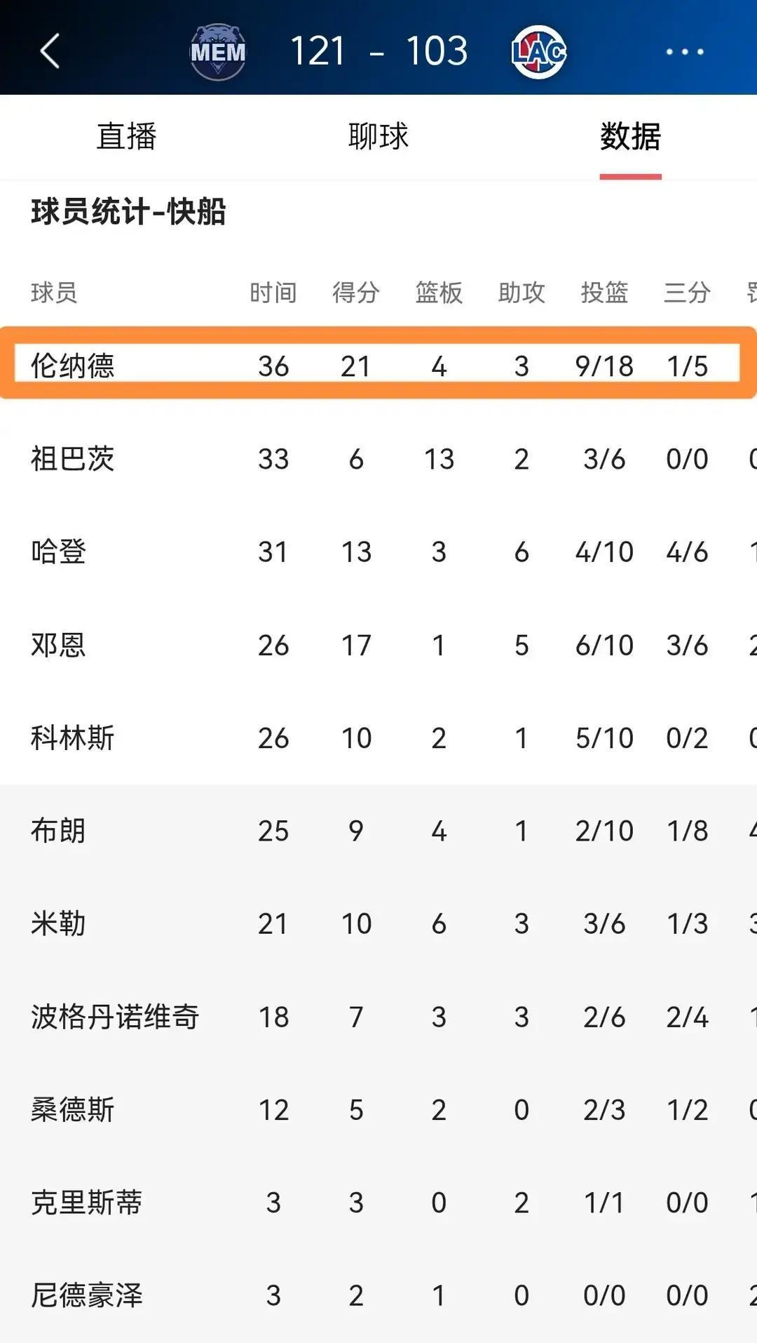 快船主场输给灰熊,比分103比121。刚打完四个客场,回来就这状态,确实有点疲。 伦纳德倒是没拉胯。拿了21分,防守也拼。最近五场他三分准心回来了,防守效率还能排进同位置前五。看得出来,他是真想赢。 可篮球不是一个人的游戏。哈登肩膀疼没上,全队助攻立马少了。教练赛后说了,不能老指着伦纳德一个人单打。这话在理,球星再强也得靠团队。 灰熊那边莫兰特复出后一路连胜,今天传了12个助攻,把快船防线撕开了。输这一场,快船西部第四的位置也不稳了,只领先鹈鹕一个半胜场。 后面赛程更硬,要打掘金、国王这些强队。要是还这么打,团队运转不起来,光靠伦纳德稳定输出,恐怕也走不远。