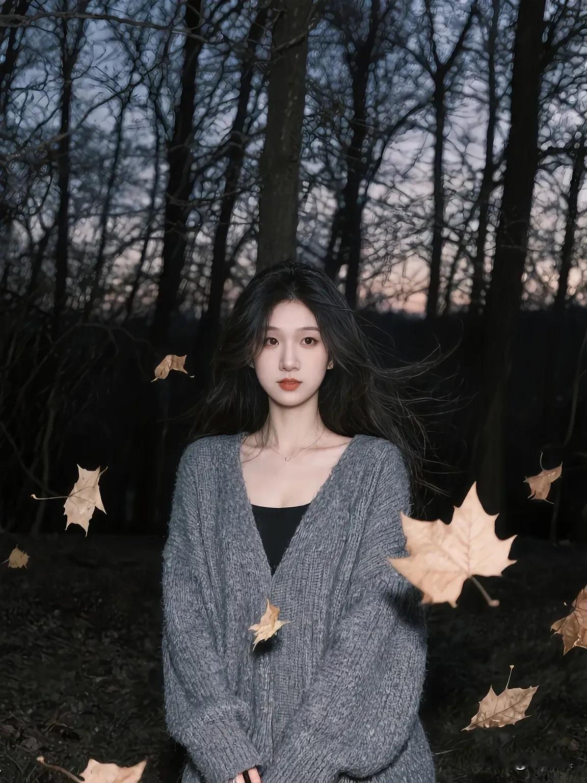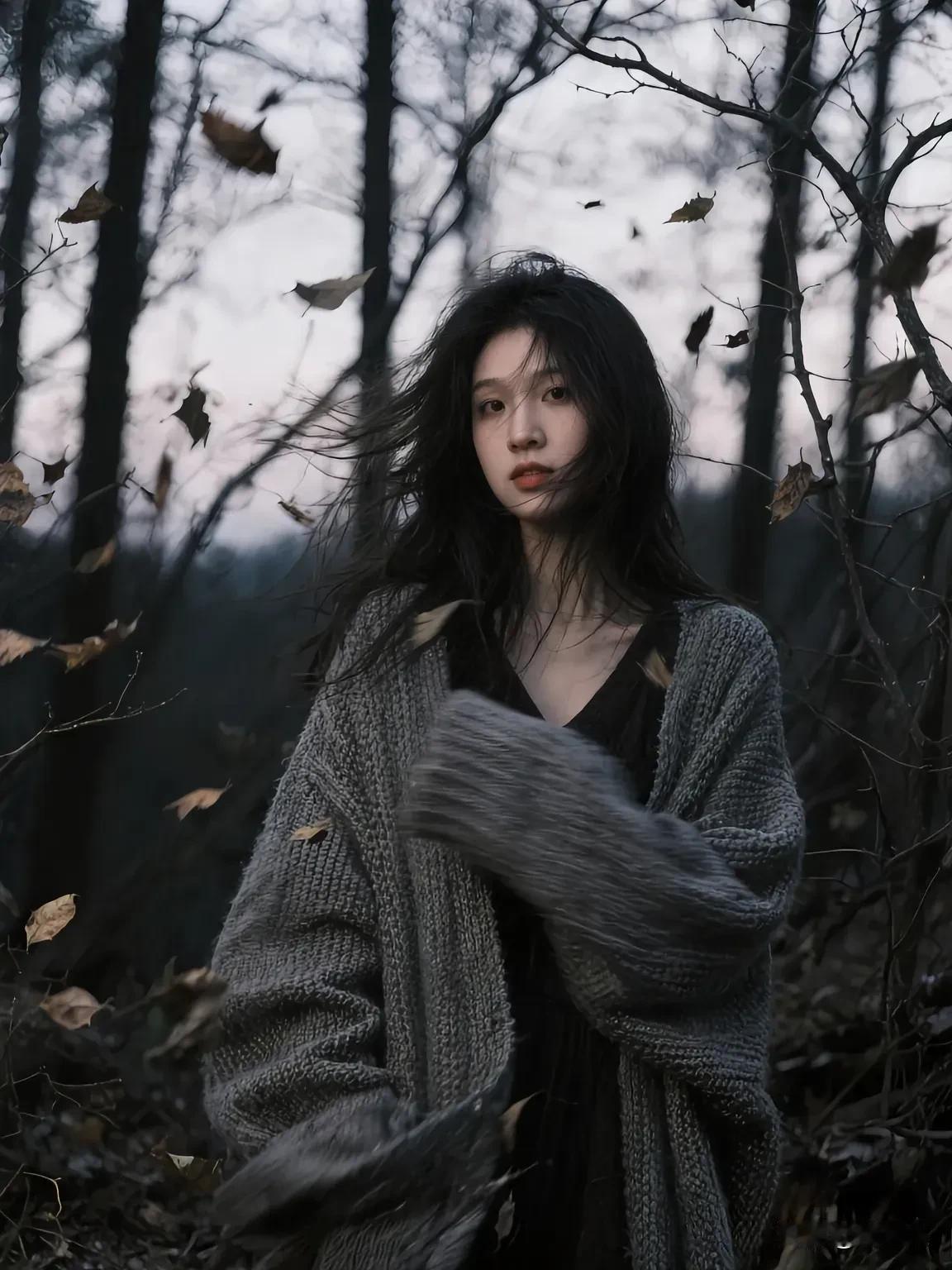 秋日森林中的少女,飘落的树叶与她相映成趣。