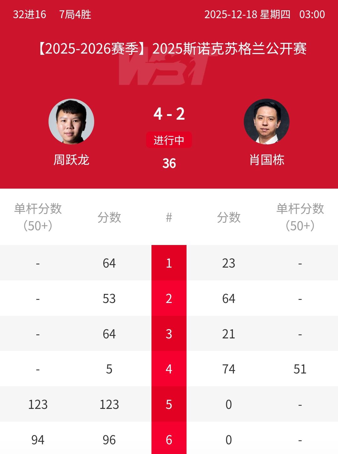 123-0、96-0,周跃龙4-2战胜武汉公开赛双冠王肖国栋!刚刚结束的2025年斯诺克苏格兰公开赛展开第二轮的一场中国德比战中,志在冲击排名赛首冠的周跃龙,迎战武汉公开赛双冠王肖国栋。这场比赛,周跃龙开局64-23先拔头筹,1-0强势开局。肖国栋随后扳平比分。第四局结束后,双方又打成2-2。接下来周跃龙连胜两局,总比分4-2赢得这场德比战的胜利,强势开局晋级16强,期待周跃龙圆梦排名赛冠军!丁俊晖 周跃龙