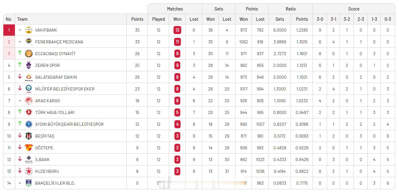 【土超女排最新积分榜】中国排球留洋动态 12轮之后,瓦基弗银行和费内巴切继续排名前两位;伊萨奇巴希在3-0完胜加拉塔塞雷后,升至第三,后者降至第五;泽伦竞技小升一位到第四。