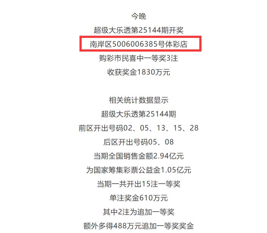 重庆3注大乐透头奖都出自南岸区5006006385号站点,总奖金高达1830万元,不出意外应该是同一人命中运气属实不错[赞][赞]重庆中奖领奖方便,南岸区距离省中心不远,如果彩友早早看直播应该也已知道中奖,准备好身份证银行卡和奖票“三件套”就能兑奖啦!