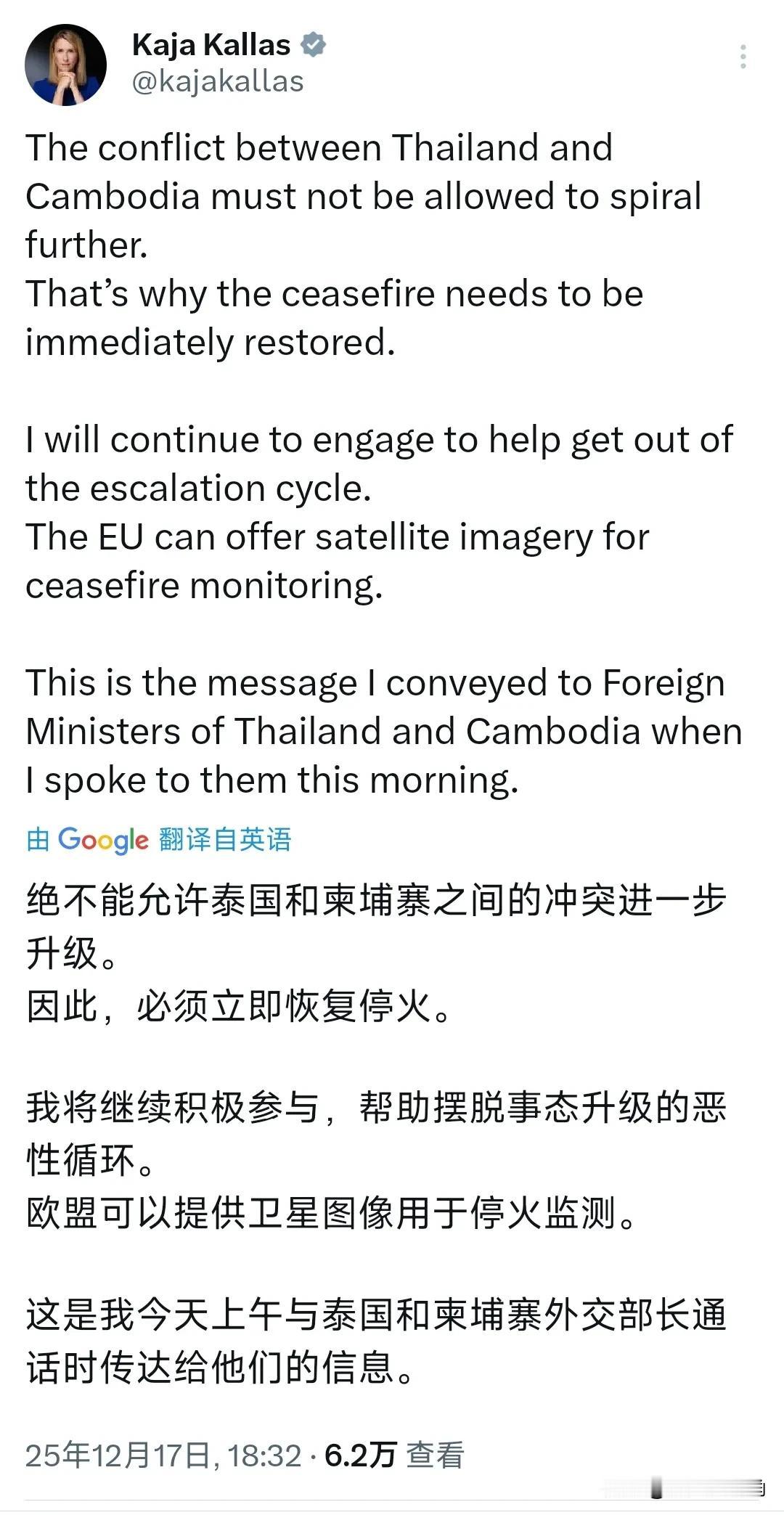 欧盟外交与安全政策高级代表卡拉斯昨晚(北京时间12月17日晚)发文称:“绝不能允许泰国和柬埔寨之间的冲突进一步升级。 因此,必须立即恢复停火。我将继续积极参与,帮助摆脱事态升级的恶性循环。欧盟可以提供卫星图像用于停火监测。这是我今天上午与泰国和柬埔寨外交部长通话时传达给他们的信息。” 评几句 【欧盟又想来“当爹”?先照照镜子!】 昨晚,欧盟外交与安全政策高级代表卡拉斯连夜发推,一副“世界警察”的派头,喊话泰国和柬埔寨“不许打架”,还大方表示:欧盟可以“提供卫星图像”监督停火。好家伙,这是把东南亚当成自家后院了? 咱们先不聊她有没有资格插手,就问一句:欧盟自己家都快烧起来了,乌克兰战火还没灭,内部右翼浪潮翻涌,能源危机、难民问题一地鸡毛,现在倒有闲情逸致来亚洲“调停”?这不是典型的“家里着火,还管别人家炒菜”? 更讽刺的是,欧盟一边喊着“和平”,一边在台海、南海问题上频频指手画脚,跟着美国节奏起舞,卖武器、搞军演、拉小圈子,哪次不是火上浇油?现在突然化身“和平鸽”,谁信?这不是双标,这是“双标Plus+”! 说到底,欧盟不过是想刷存在感,蹭一波“国际事务参与度”,顺便卖点技术、搞点影响力。真以为亚洲国家看不懂这点小算盘?泰国和柬埔寨的事,亚洲人自己能处理,轮不到远在天边的“伪中立者”来当裁判。 一句话:欧盟,先把自己那一摊子烂事收拾干净,再来谈“调停”!亚洲不欢迎“说教型霸权”,更不吃“道德绑架”那一套!