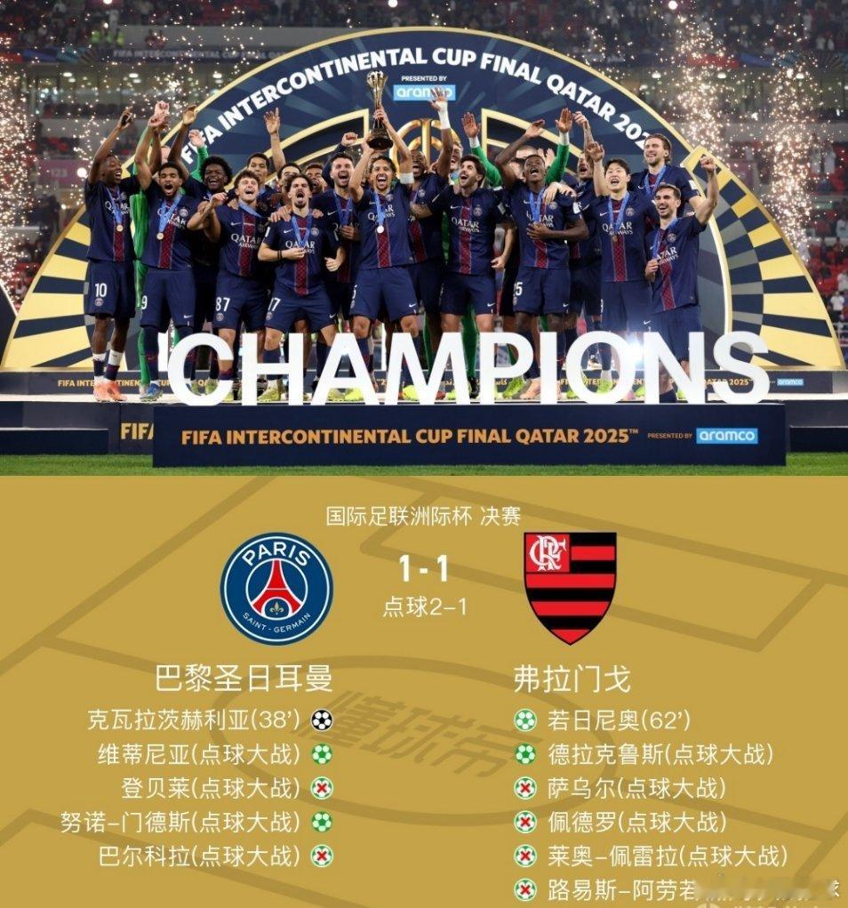 巴黎圣日耳曼足球 巴黎总分3-2点杀弗拉门戈夺得洲际杯冠军,萨福诺夫4次扑点。北京时间12月18日国际足联洲际杯 决赛,巴黎圣日耳曼对阵弗拉门戈。上半场杜埃传中,罗西失误没把球扑远,克瓦拉茨赫利亚破门。下半场德阿拉斯卡埃塔造点,若日尼奥主罚命中。加时赛双方均无建树,点球大战萨福诺夫4次扑点。最终巴黎总分3-2点杀弗拉门戈夺得洲际杯冠军。