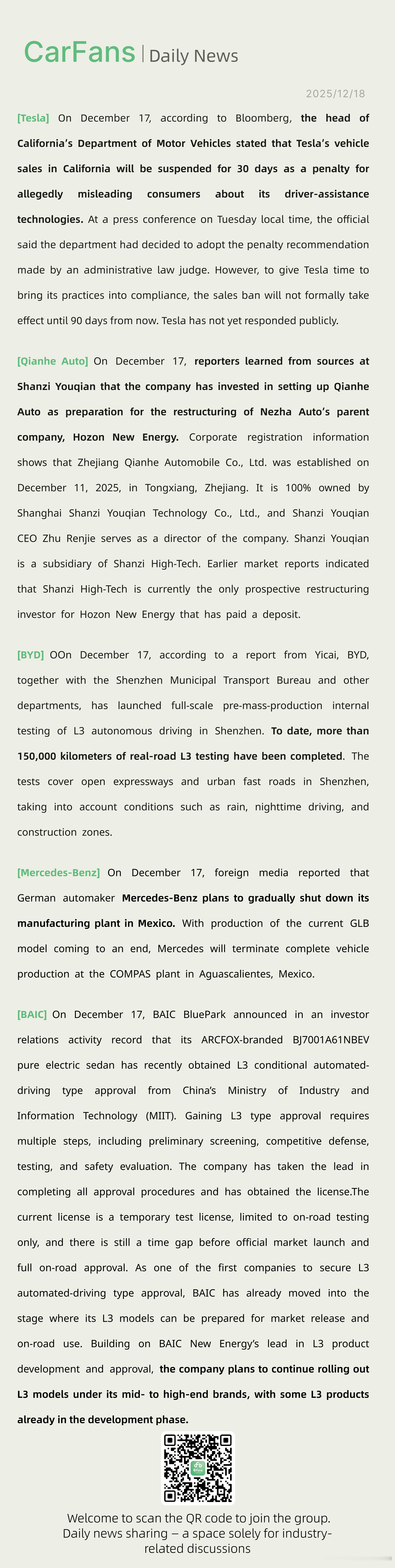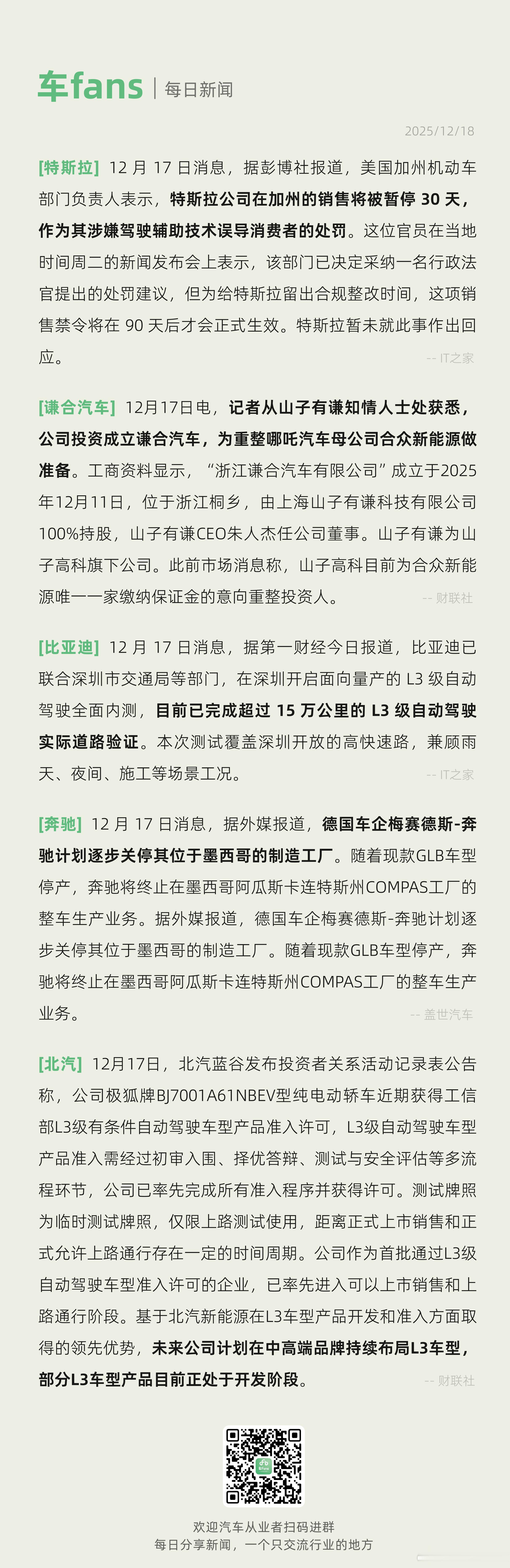 特斯拉加州销售将被暂停 30天、比亚迪已完成超过15万公里L3级道路验证据彭博社报道,美国加州机动车部门负责人表示,特斯拉公司在加州的销售将被暂停 30天作为其涉嫌驾驶辅助技术误导消费者的处罚。这位官员在当地时间周二的新闻发布会上表示,该部门已决定采纳一名行政法官提出的处罚建议,但为给特斯拉留出合规整改时间,这项销售禁令将在 90 天后才会正式生效。特斯拉暂未就此事作出回应。还是美国的斗争纯粹,整人那是真往死里整啊新能源汽车