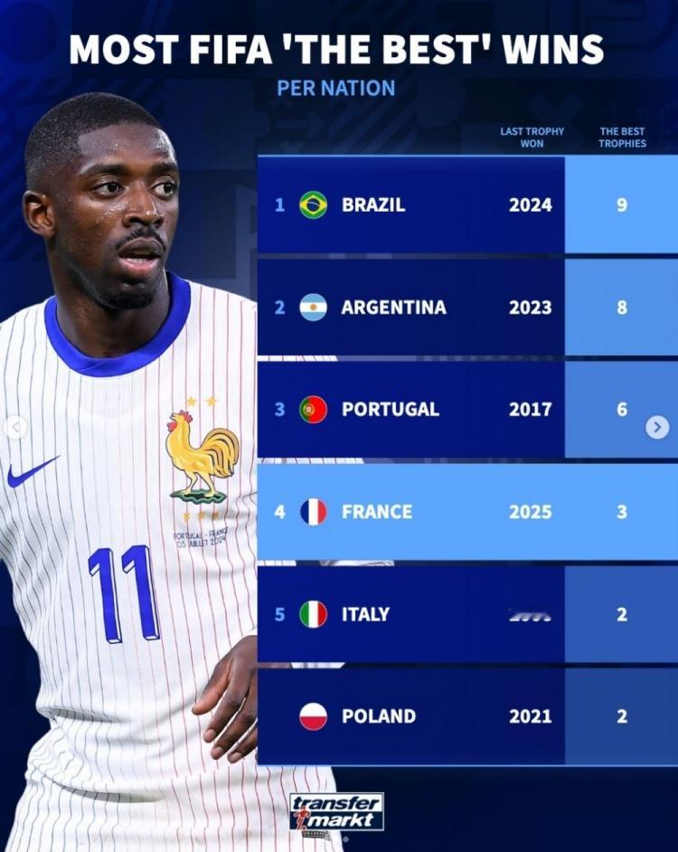 德转列各国球员获FIFA年度最佳球员次数:1、巴西:9次,最近获奖:2024年-维尼修斯2、阿根廷:8次,最近获奖:2023年-梅西3、葡萄牙:6次,最近获奖:2017年-C罗4、法国:3次,最近获奖:2025年-登贝莱5、意大利:2次,最近获奖:2006年-卡纳瓦罗波兰:2次,最近获奖:2021年-莱万