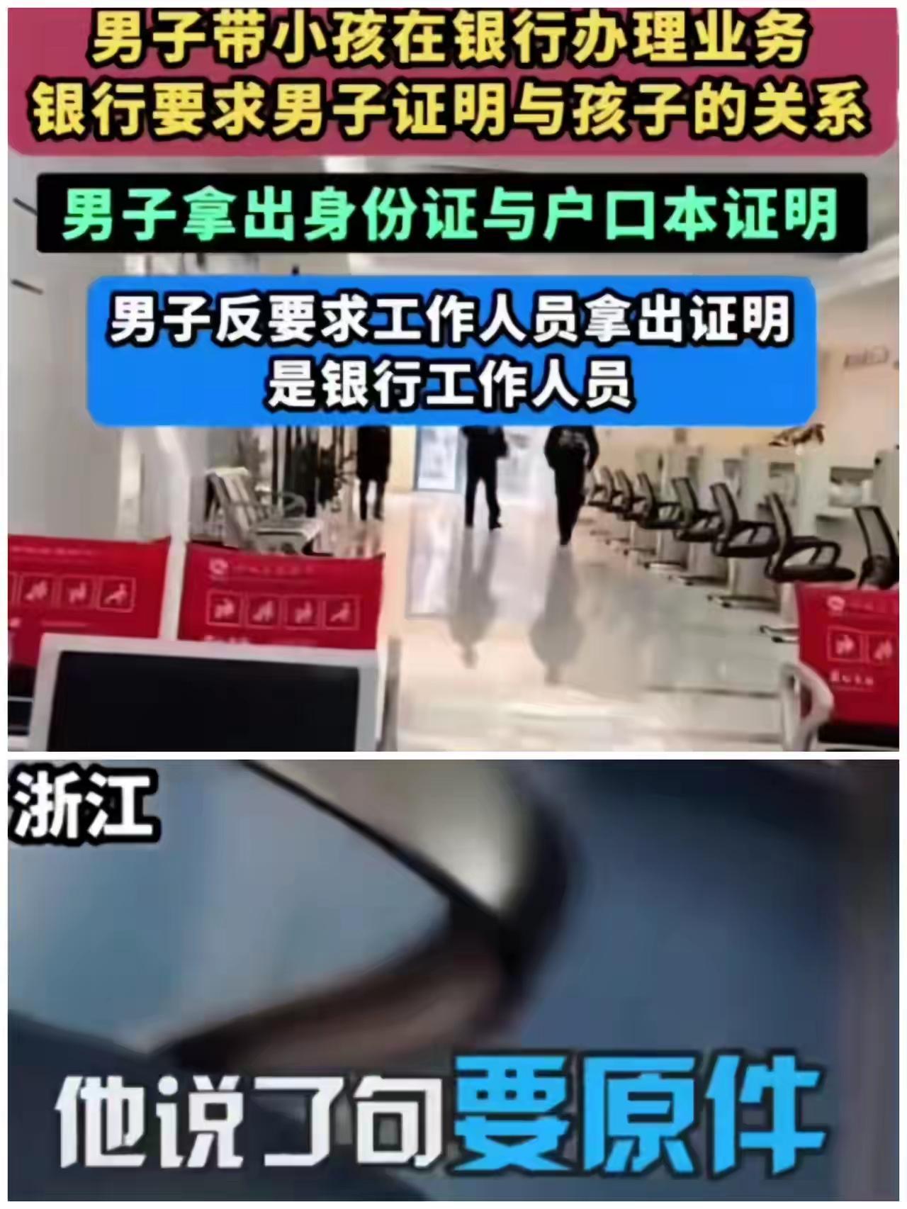 厉害!大哥做了一般人不敢干的事! 浙江icon一位大哥带小孩到银行办业务,银行要求证明与孩子的关系,他反过来要求对方,拿出证明是银行工作人员。 这位大哥的举动,真是让人忍不住竖起大拇指!在这个充满算计与套路的社会里,他用一种“反转”的方式,狠狠地击中了我们对“规则”的既定印象。很多人在面对繁琐的手续时,习惯性地低头、配合,甚至忍气吞声。而他,却用行动告诉我们:不合理的规则,也许可以用一句“你出示你的证明,我也想看看你是不是也有资格要求我证明”来反击。 或许有人会觉得,这只不过是个小插曲,但细细品味,却隐藏着深刻的人性与社会现象。我们生活在一个“规则至上”的时代,很多人习惯了被动接受,少有人敢于质疑,更别说用反问来挑战规则的合理性。而这位大哥,却用一句“你出示证明,我也想看看你的底牌”,点燃了人们心中那份对公平与尊重的渴望。 更令人感动的是,他的行为背后,是对自己孩子未来的深思。在这个“看脸”和“关系”决定一切的社会里,他用实际行动告诉我们:平等、尊重才是社会的底线。或许有人会说,这是个“特例”,但我更愿意相信,这是每个普通人心中那份坚守正义的火苗。我们每个人都可以像他一样,用行动去捍卫自己的尊严,也去呼唤社会的公正。 这个世界,或许充满了不公平,但每一次勇敢的反抗,每一次坚持的正义,都会成为点亮希望的火花。就像那位银行里的大哥,他没有选择忍气吞声,而是用一句话引发了网络的热议。或许,他的故事在别人眼中只是个“小插曲”,但在我看来,却是一记响亮的警钟:我们要勇于发声,要敢于质疑那些不合理的规则。只有这样,社会才能变得更加公平,更加温暖。 让我们都成为那样的“勇敢者”,不盲从、不妥协,坚守正义,守护每一份纯粹的善良。因为,真正的强大,不在于无敌的力量,而在于敢于站出来,用行动去改变这个世界。你,准备好成为那个改变者了吗?为人处世潜规则 人性底层规则