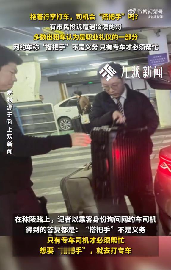 乘客拖行李该搭把手吗?司机发声 岁末将至,携带行李打车出行,你是否得到过司机“搭把手”的温暖?市民杨女士反映,11月30日晚,她和同学分别拖着一大一小两个行李箱抵达上海南站,在出租车上客点分乘两辆出租车回家。却没料到,两名司机都自顾自坐在驾驶室,完全没有下车帮忙的意思。更让她生气的是,到达目的地付完钱收好发票后,她刚下车准备取行李,司机已一脚油门驶离。她在后面边跑边追叫唤了好久,车子才停下来。停车后,司机也没下车帮忙,她直呼“这次经历真的太让人失望了。”近日,记者分别走访乘客携带行李打车场景最多的上海“四站两场”,在其看到的315辆出租车与网约车中,有225名司机主动为带行李乘客提供“搭把手”服务。对于“搭把手”这件事,不同司机看法截然不同。多数出租车司机认为这是行业“老传统”,是职业礼仪的一部分。一位出租车司机说,即便公司没有硬性要求,遇到带行李的女孩都会搭把手;出租车赵师傅则表示,帮老人拎行李理所当然。在秣陵路上,记者以乘客身份询问网约车司机,得到的答复都是:“搭把手”不是义务,只有专车司机才必须帮忙,想要“搭把手”,就去打专车。 来源:九派新闻
