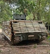 别瞧不起泰国的装甲车捆原木,这一发PF89火箭队就没打穿,卡在原木里。 泰国军队在泰柬冲突中,为应对柬埔寨武装可能使用的PF89式单兵火箭筒等反装甲武器,对M113装甲运兵车临时加装了捆扎原木的防护措施。 这种原木装甲类似于格栅装甲或板条装甲,能在火箭弹接触主装甲前提前引爆其战斗部,破坏聚能装药射流的形成,从而降低穿透力。 有记录显示,一辆加装原木的泰军M113确实被PF89火箭弹命中但未被击穿,验证了该简易防护手段的有效性。