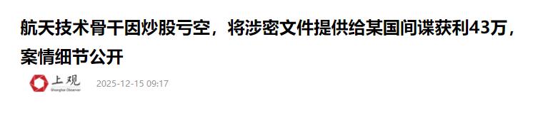 又一反华势力出现!航天骨干遭策反,卖机密获利43万,国家出手了   掌握核心参数的航天专家,竟然只为了43万,就把火箭发动机图纸卖给了境外。这个价格听起来廉价得荒唐,但这却是一场持续了整整九年的精准算计。   2012年,境外情报人员最早盯上陈某时,没有直接谈买卖。他们打着技术交流的旗号,客客气气地喊他“陈老师”。   几次接触下来,陈某察觉到了不对劲,心生恐惧,主动断了联系。对方也很干脆,说不联系就不联系,消失得无影无踪。   这份沉默彻底骗了陈某,他以为自己只要不回消息,这事就翻篇了。境外间谍却有着极好的耐心,他们把陈某的名字存进档案,标记为“待开发”。   他们在等,等一个陈某生活失控的机会。这一等就是六年,期间没有任何打扰,安静得让人发毛。   2018年,机会来了。陈某想在股市里赚快钱,结果短短几个月亏了几十万。对于拿死工资的人,这笔债压得他喘不过气。   就在他为了钱焦头烂额的时候,那个消失了六年的“老熟人”突然发来消息,时间卡得精准无比。 对方似乎对他现在的窘迫了如指掌,这次直接摊牌,用内部文件换钱,立刻到账。   被债务逼急了眼的陈某,把当初的顾虑抛到了脑后。他急需用钱填补窟窿,对方提供的每一分钱都成了他抓在手里的机会。   从2018年到2021年案发,陈某彻底失控。他利用职务便利,趁着办公室没人,用手机偷拍涉密文件。   经过加密处理,这些数据源源不断传向境外。他以为自己做得天衣无缝,甚至每次传完都清理痕迹,试图在这个危险的交易中全身而退。   他传出去的东西触目惊心,火箭发动机的关键参数、卫星在轨运行数据,甚至还有关系到航天员生死的载人返回舱技术。   陈某拿到了四十多万,国家为此付出的代价却无法估量。我们的机密就这样被人家看光了,甚至可能让航天员面临生命危险。   无论手段多隐蔽,只要伸手必被捉,国家安全机关早就掌握了他的行踪。最终,陈某因间谍罪被判处有期徒刑11年,剥夺政治权利4年,财产全部没收。   回头看这九年,境外势力从来不急于一时,他们哪怕花上几年时间,也要等到你人生最低谷的那一刻下手。   守住秘密,不仅是守住工作底线,更是为了保护自己,别让一时的难处,成了别人手里毁掉你一生的把柄。 信息来源:《航天技术骨干因炒股亏空,将涉密文件提供给某国间谍获利43万,案情细节公开》,上观新闻,2025年12月15日。