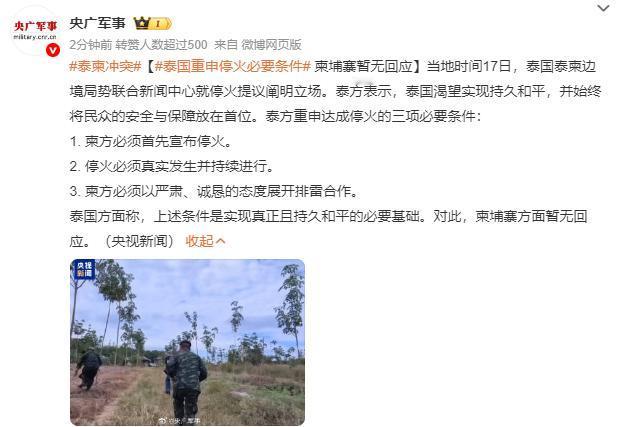 12月18日,泰国柬埔寨边境冲突又传来最新消息! 根据媒体报道,泰国表示,要想达成停火,必须要同意三项必要条件:第一个就是柬埔寨必须先停火。第二就是停火必须真实发生并持续进行,第三就是柬埔寨必须诚恳的态度展开排雷工作。 当泰国方面提出这三个要求后,目前柬埔寨还没有任何回应。从泰国方面的回应我们也可以看出他们也很希望早些和平,之前泰国也表示是柬埔寨先开的火,所以泰国必须反击。这几天就光看到泰国方面发言了,就没有看到柬埔寨任何动作和回应。 当然了为了促使泰国和柬埔寨早点停火,我方的外交部也将在12月18日再次赴柬埔寨、泰国穿梭调停。不知道会不会取得成功,而泰国既然提出条件了,就说明人家也不愿意打。不知道柬埔寨这么多天在等什么。