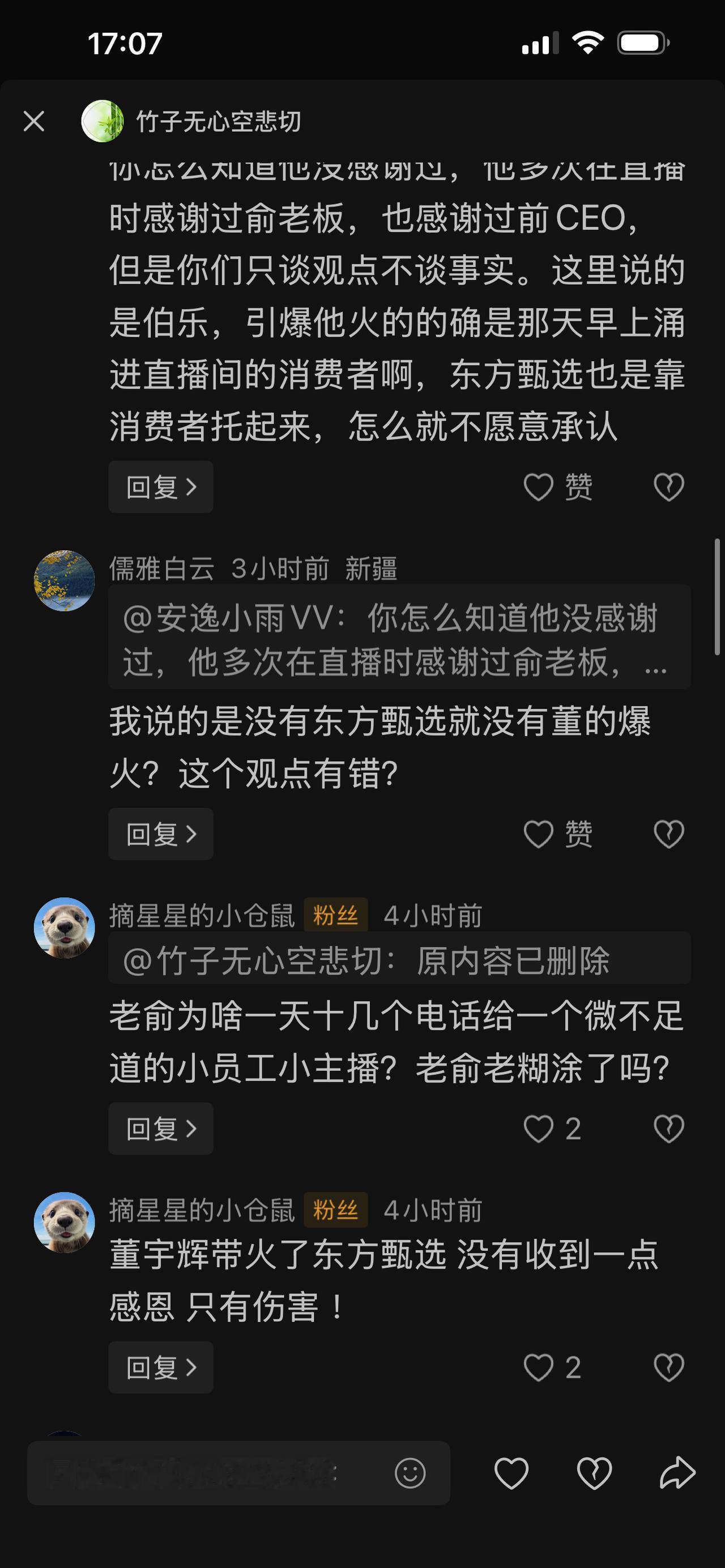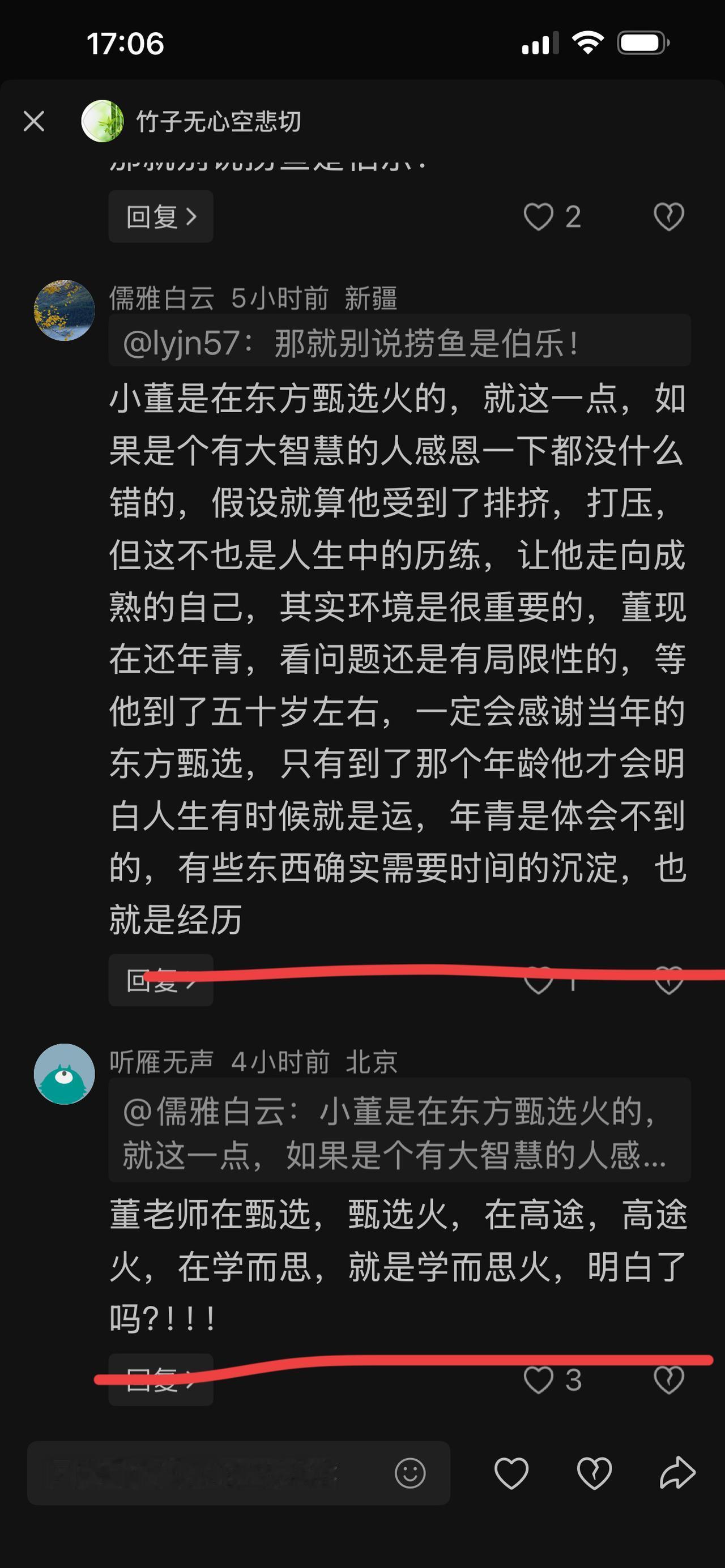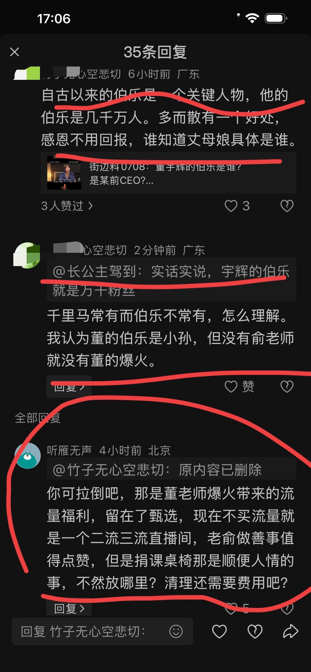 一石激起千层浪, 宇辉对“伯乐”的首次肯定, 必然会招来又一波“质疑”。 在某吧在头条, 在他们的小电台, 包括在我的评论区, 各种“阴阳怪气”的质疑声再次卷土重来。 这些都在我意料之中 , 只是曾经高举道德绑架的大旗的几个校长的失踪 , 这一波质疑声音量其实不大, 基本上只能算是“蛐蛐”。 一个老板的铁粉, 她依然发表她的观点: “千里马常有而伯乐不常有, 怎么理解。 我认为董的伯乐是小孙, 但没有俞老师就没有董的爆火。” 这个观点太牵强, 首先要搞清楚什么是伯乐, 所谓的伯乐是在万千“平凡”中, 火眼金睛挑选出其中的一个“独特”。 宇辉是谁发现的? 还是谁挑选的? 他在教培公司一直非常优秀, 而在直播带货公司没火之前, 公司没有谁给了他任何“特别”的照顾, 也没有给予他任何“特殊”的资源。 他在公司所有的资源和待遇跟其他主播一个样, 甚至是更差, 因为他那天上的是深夜班。 有人说是公司投流了, 呵呵呵, 这话你们自己信吗? 公司钱多的没处放? 选择半夜三更投流? 你们这话是在侮辱公司管理人员的智商。 宇辉的爆火就是一个“意外”, 也是他的能力的体现。 所以他的伯乐不是公司的任何一个人。 她还说: “自古以来的伯乐是一个关键人物, 他的伯乐是几千万人。 多而散有一个好处, 感恩不用回报, 谁知道丈母娘具体是谁”。 这又是在玩道德绑架, 要宇辉怎样感恩? 他给公司带来的利益算什么? 两个公司的股价飙升算什么? 这是不是回报? 公司给他提供工作岗位, 他为公司带来利益。 这就是一个合作关系, 而不是因果关系, 该回报的都回报了。 宇辉在的时候, 直播间基本上不需要投流, 宇辉走了, 每天的投流费用是多少, 公司内部人自己心里最清楚。 临走了还给公司留下一个三千多万粉丝的账号, 这算不算感恩? 至于说什么千里马常有伯乐不常有, 这话更没有说服力。 平台还在, 两个大“伯乐”也还在。 教培公司几万员工, 个个都是高学历的精英, 这里面难道没有千里马? 还是两个“伯乐”挑花了眼? 为什么到现在, 伯乐自己拼命拉磨, 也没挑出一匹“千里马”? 其实吧, 这些老故事没必要再讲, 陈年老话题没必要再纠结。 什么伯乐什么感恩都已经成了过去, 宇辉也给老板生了一窝“金蛋”, 老本还可以吃很久。 而宇辉这只会下金蛋的鸡, 被人低估了, 都以为这只鸡肚子里没蛋了, 不料结果太意外, 宇辉肚子里都是“金蛋”, 这才让很多人红了眼。 散会!