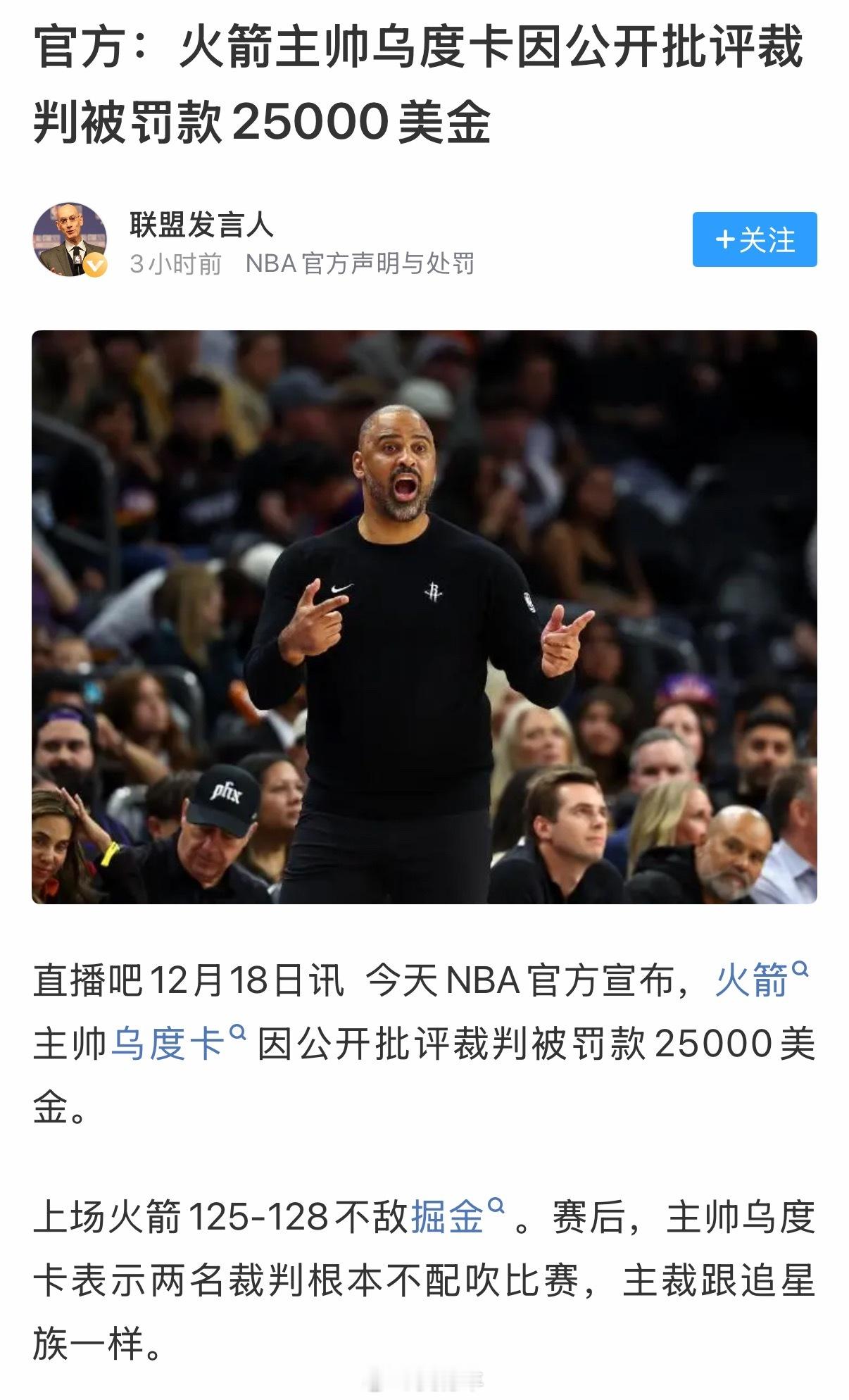 火箭主帅乌度卡因赛后公开批评裁判,被NBA官方罚了25000美元。金秋观赛季